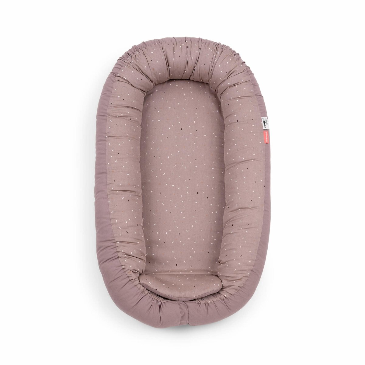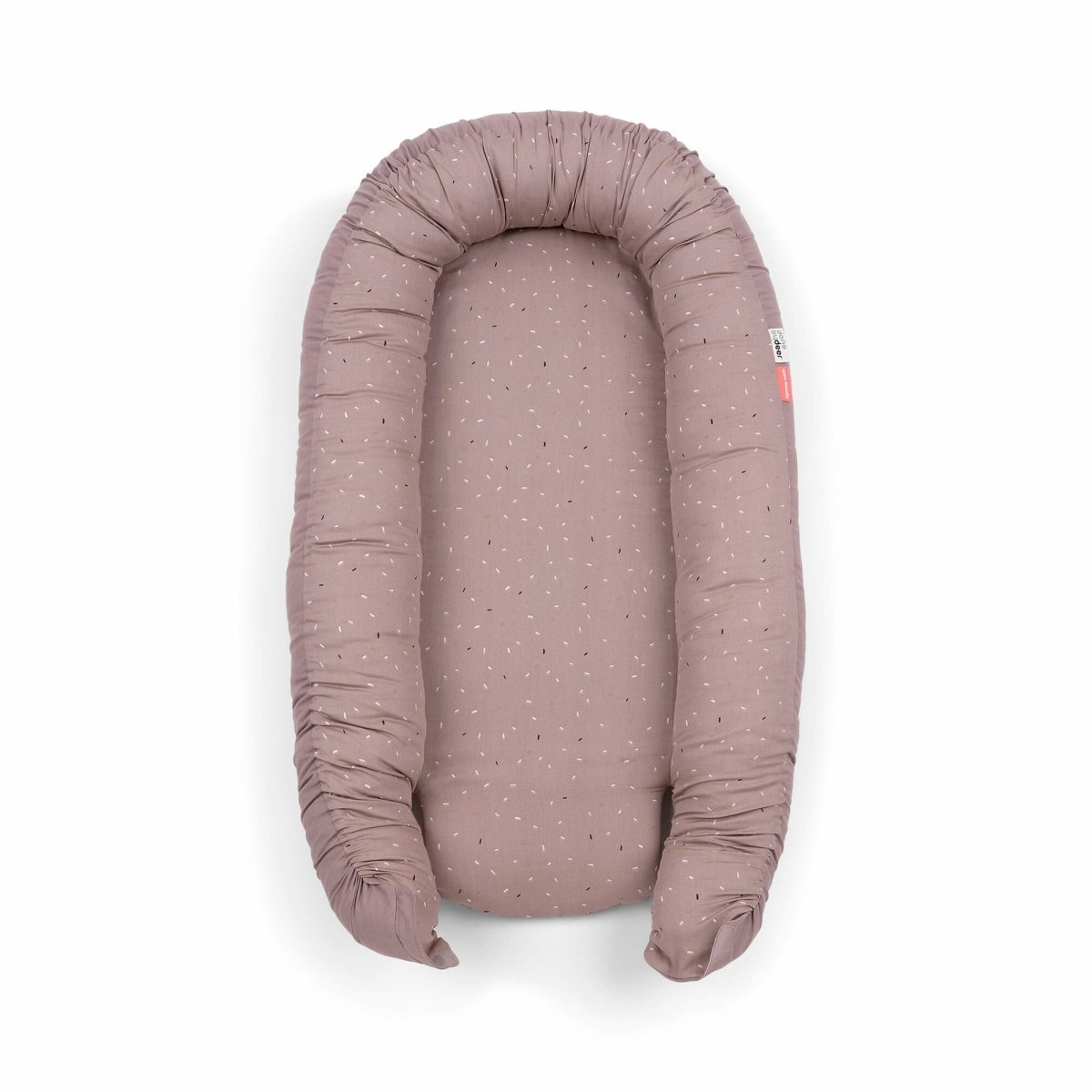 Pudrowe przytulne gniazdko jest posypane świątecznym konfetti wewnątrz i ma gładki pudrowy kolor na zewnątrz. Gniazdko dziecięce jest wykonane z miękkiej bawełny z poliestrową wyściółką i ma miękki jednoczęściowy materac piankowy.