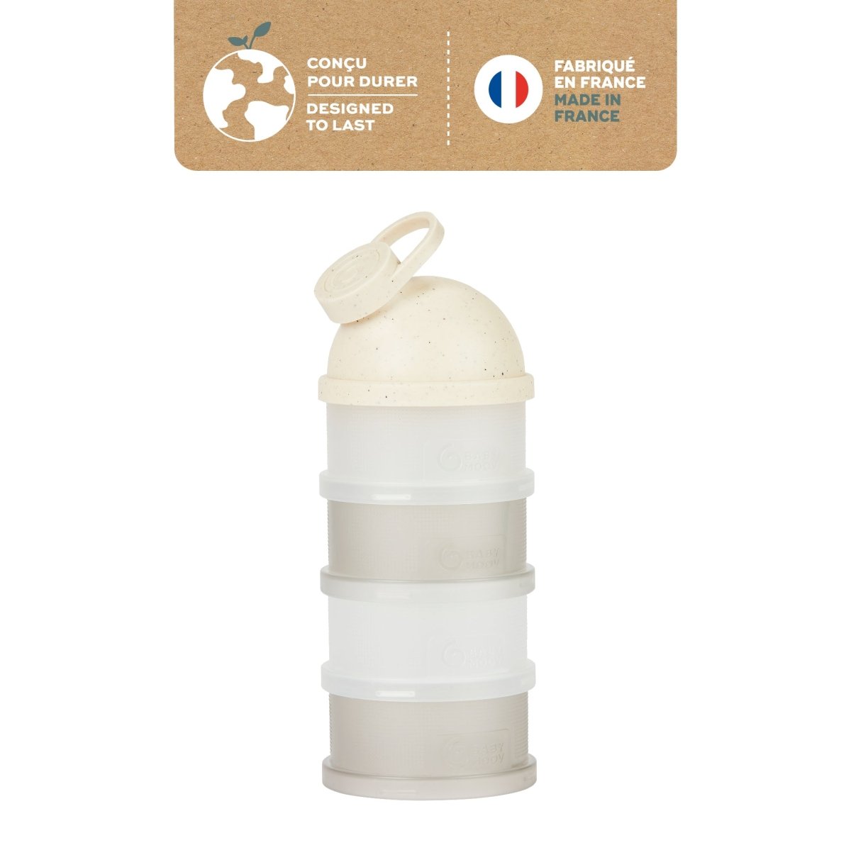 Kolejne 4 hermetyczne przegródki, w 2 różnych kolorach i przezroczyste, pozwalają łatwo zidentyfikować zawartość. Możesz również wprowadzić przygotowaną ilość mleka w proszku, aby określić poranną, popołudniową lub wieczorną dawkę.