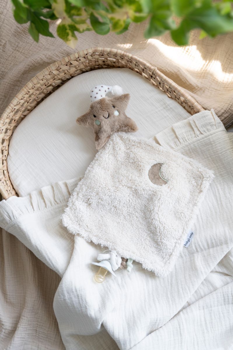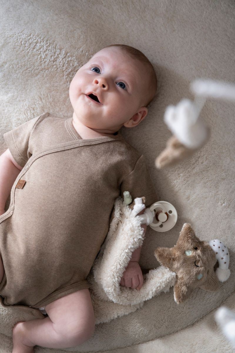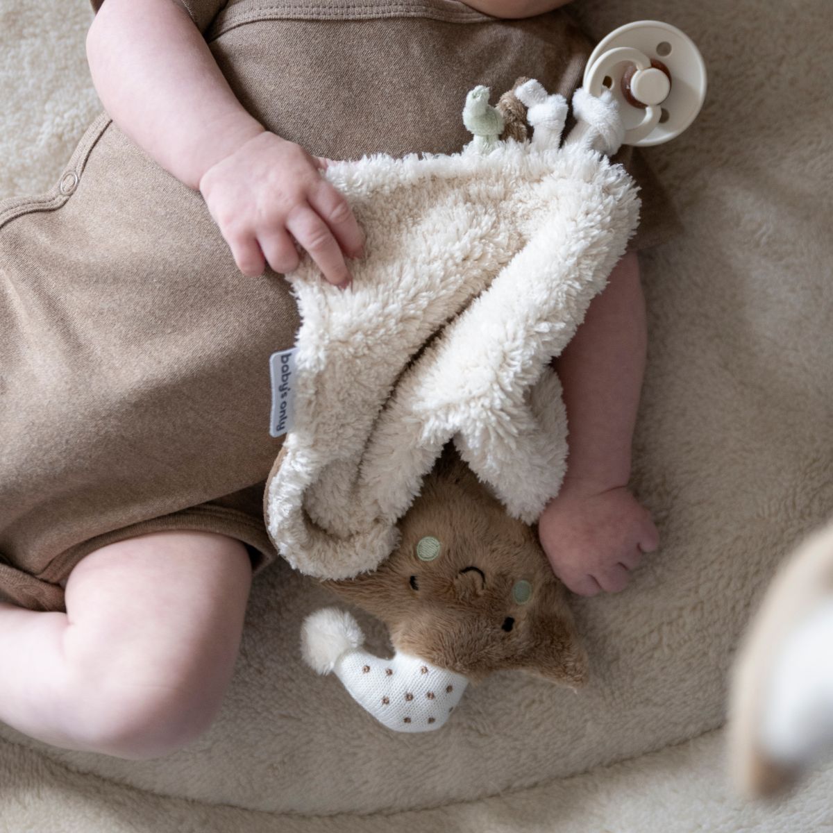 Przytulny kocyk w ciepłych, neutralziemistych odcieniach i beżu jest wykonany z różnych materiałów, takich jak pluszowy polar, miękki welur oraz dzianinowa i haftowana przędza poliestrowa - idealna dla małych odkrywców. Niezależnie od tego, czy jest to miękki materiał do przytulania, czy ciekawe tekstury do dotykania i gryzienia, jest wiele do odkrycia. Gdy naciśniesz małą gwiazdkę, usłyszysz radosny pisk, zapewniający dodatkową zabawę i małe niespodzianki.