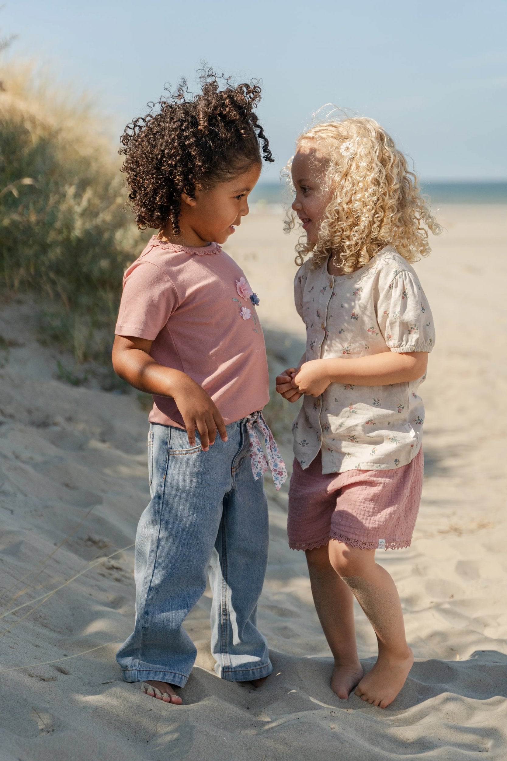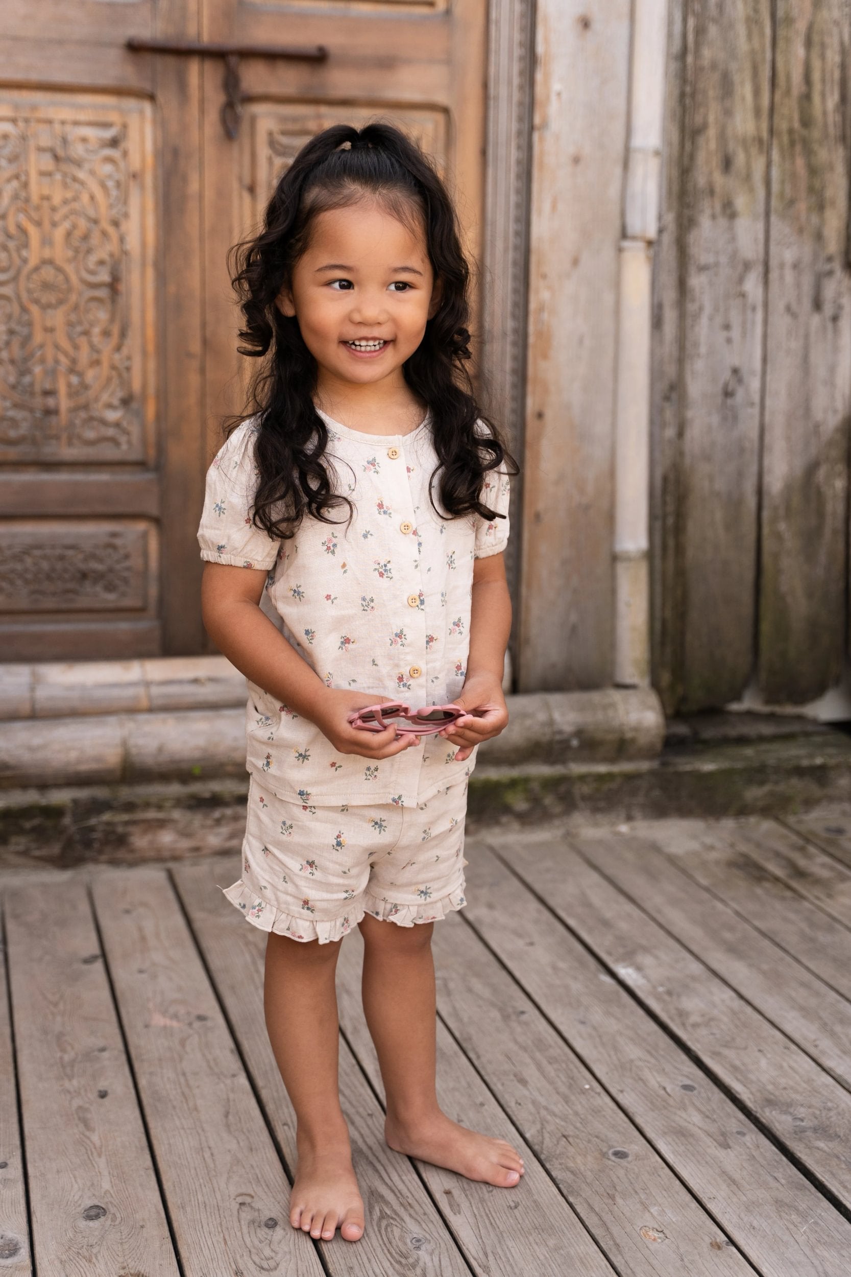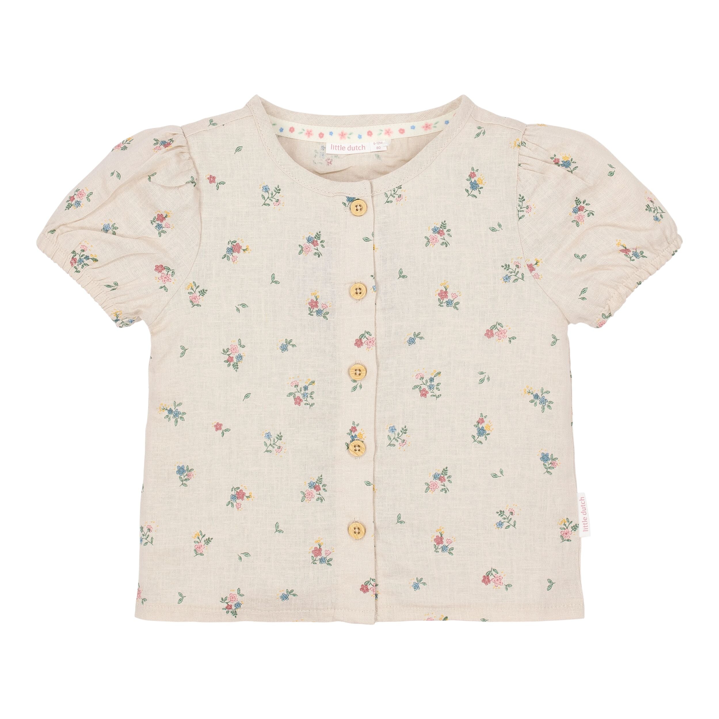 Letnia, przewiewna i pełna delikatnych detali. Ta bluzka z krótkim rękawem w kolorze Fairy Bloom jest wykonana z tkaniny o wyglądzie lnu i ozdobiona delikatnym kwiatowym nadrukiem. Idealna na dni pełne zabawy i zachwytu.