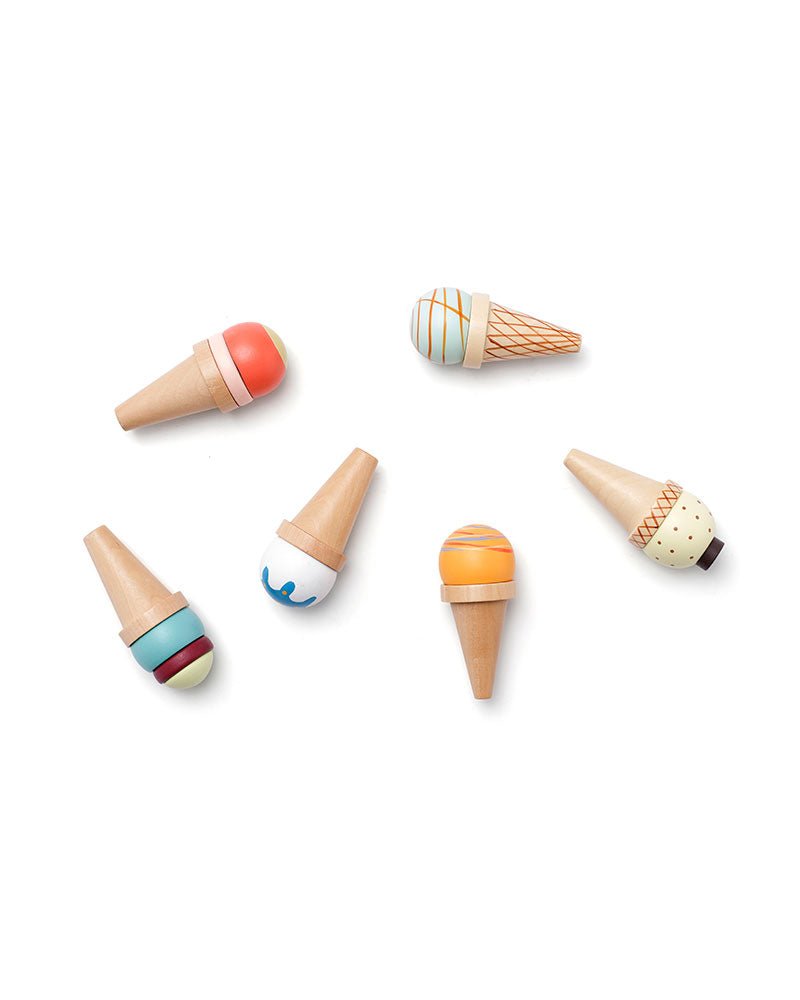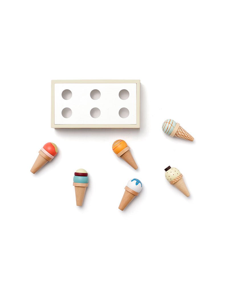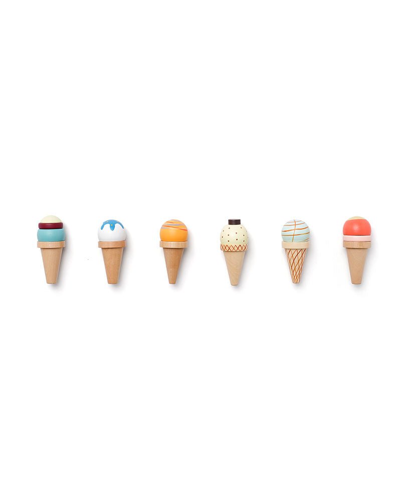 Ciesz się niekończącą się zabawą z tym zestawem sześciu drewnianych rożków do lodów, z których każdy ma unikalny wzór, który zachęca dzieci do angażowania się w pomysłowe odgrywanie ról. Rożki do lodów są dostarczane w poręcznym drewnianym pudełku z pokrywką, wyposażonym w sześć otworów, dzięki którym wszystko jest na swoim miejscu. Dzieci mogą "sprzedawać lody" razem z przyjaciółmi i rodziną w swojej kuchni do zabawy lub na stoisku z lodami, rozwijając umiejętności społeczne i wyobraźnię