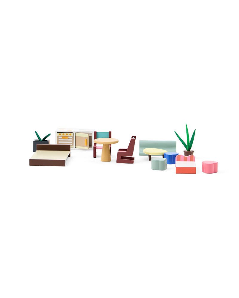 Witaj w domu rodziny, która kocha projektowanie wnętrz! Ten stylowy trzypiętrowy drewniany domek dla lalek emanuje atmosferą, komfortem i kreatywnością. Każdy pokój ma swój własny styl, kolory i meble, inspirowane podróżami i przygodami na całym świecie