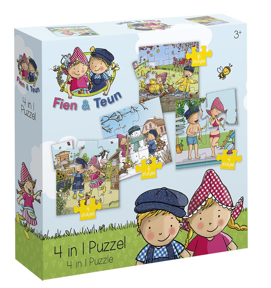 Zestaw składa się z 4 układanek, każda z kolorowym obrazkiem z serii Fien & Teun w różnych porach roku wiosna, lato, jesień i zima.