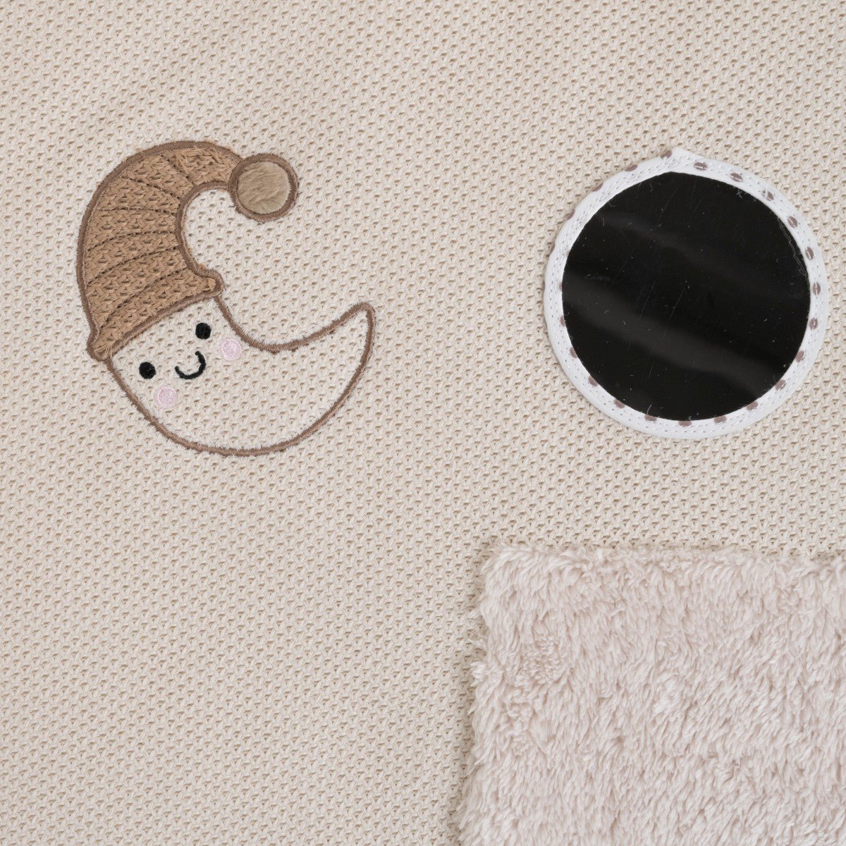 Rozpoznawalne figury księżyca, gwiazdy i chmury zostały subtelnie i zabawnie wkomponowane w projekt. Pobudzają ciekawość Twojego dziecka i stymulują zmysły poprzez patrzenie i czucie. Pośrodku znajduje się bezpieczne dla niemowląt lusterko , które wprawia dziecko w zachwyt i pozwala mu po raz pierwszy zobaczyć własne odbicie