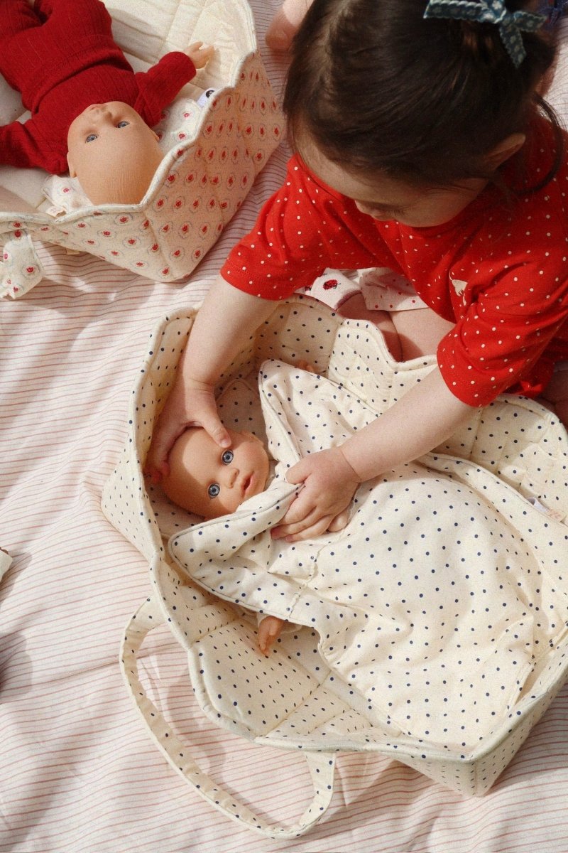 Miękka pikowana pościel dla lalek wykonana w 100% z bawełny, idealna do przytulnego i wygodnego łóżeczka dla lalek. Zaprojektowana z miękką lamówką dla stylowego wykończenia. Pościel jest dostarczana w pasującej torbie ze sznurkiem, poręcznej do przechowywania lub zabrania ze sobą w podróż.