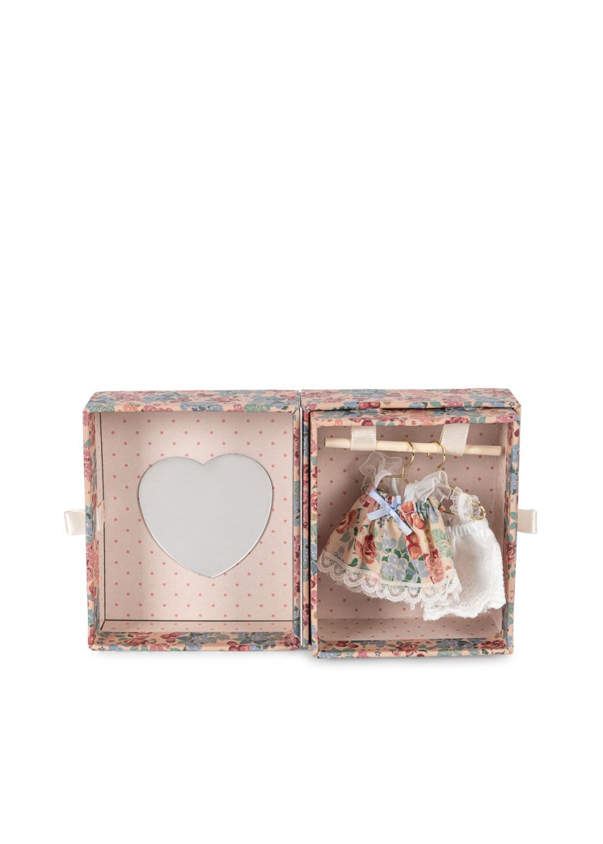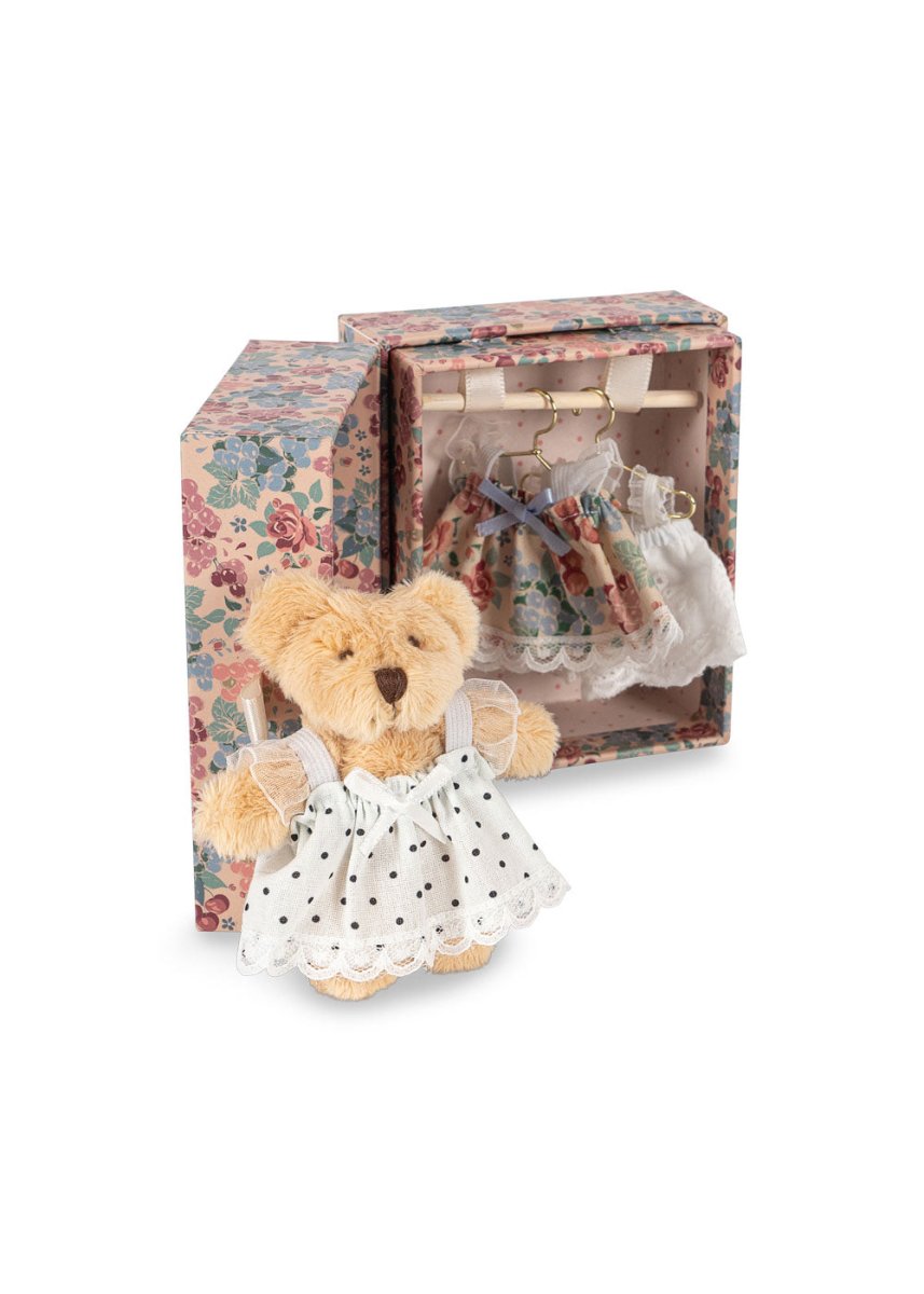 Zestaw zawiera misia, mini szafę z lustrem w kształcie serca i trzy różne sukienki do założenia. Idealny do pomysłowego odgrywania ról i kreatywnego przebierania się.