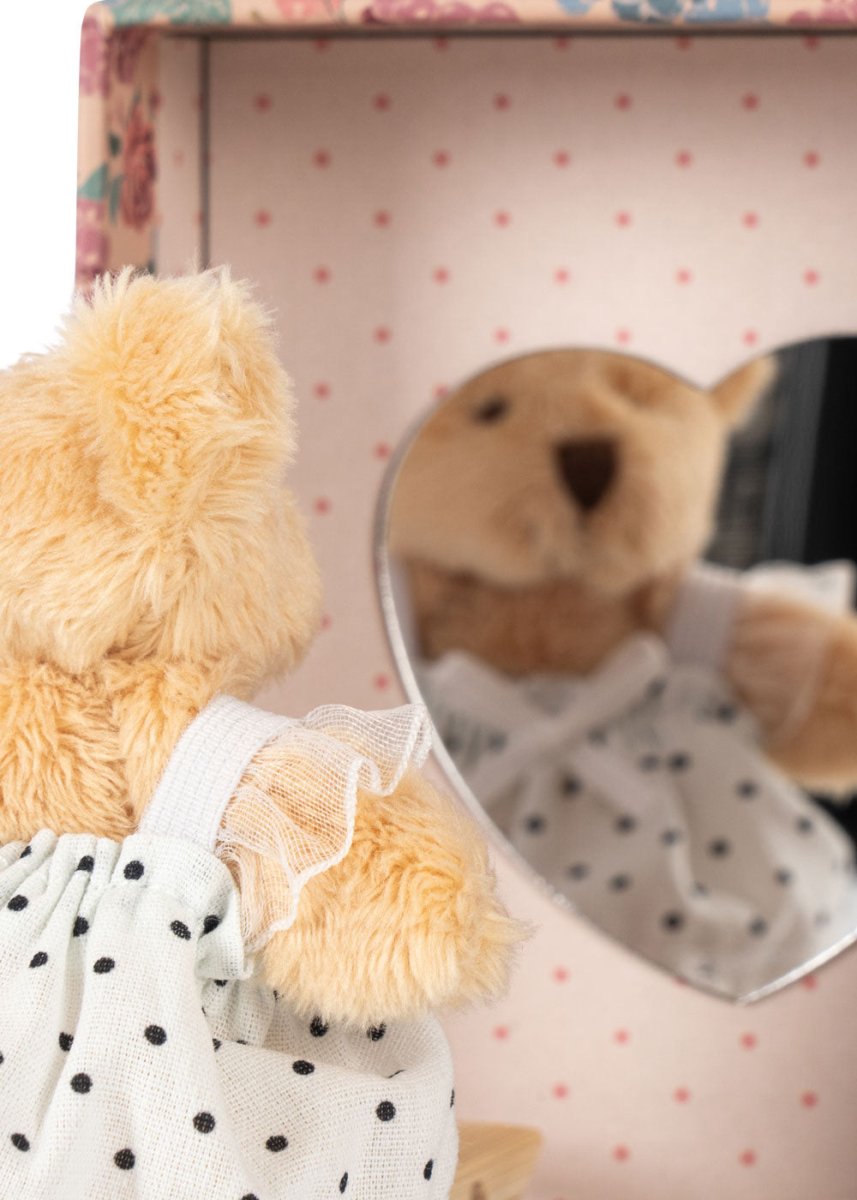 Poznaj naszego Malutkiego Misia, który uwielbia się przebierać! Każdego dnia radośnie kręci się przed swoim lustrem w kształcie serca w swoich uroczych, małych sukienkach i wymyśla nowe, zabawne stroje. Tiny Teddy mieszka i śpi w swojej małej szafce - ostrożnie otwórz drzwiczki, a będzie gotowa na kolejny dzień zabawy.