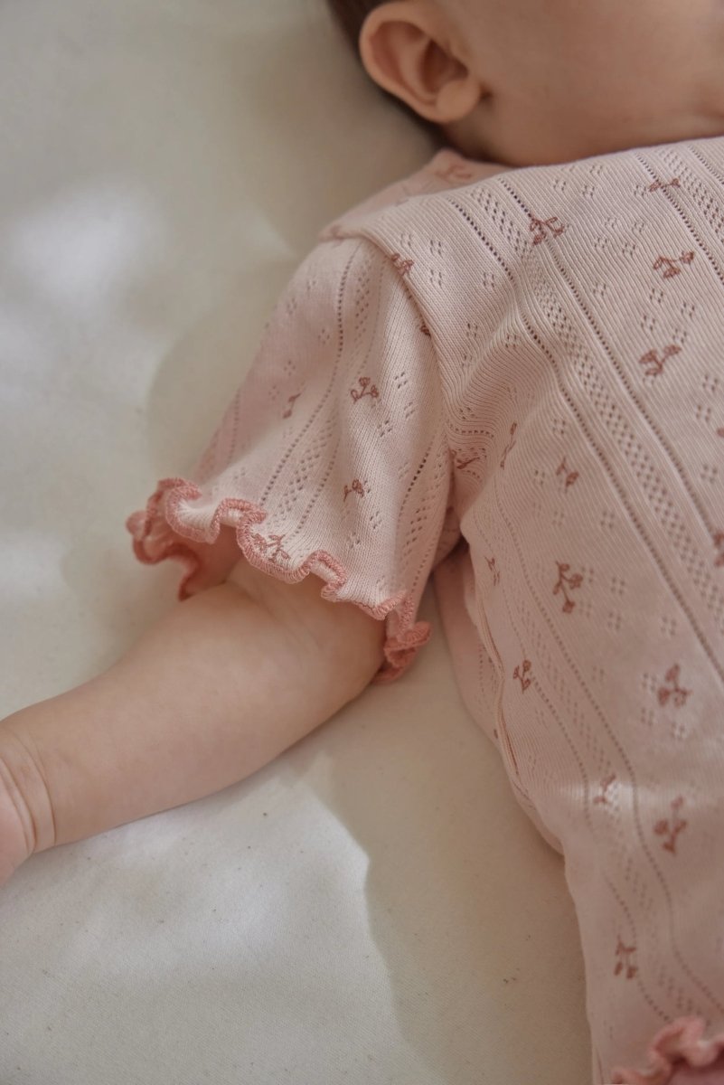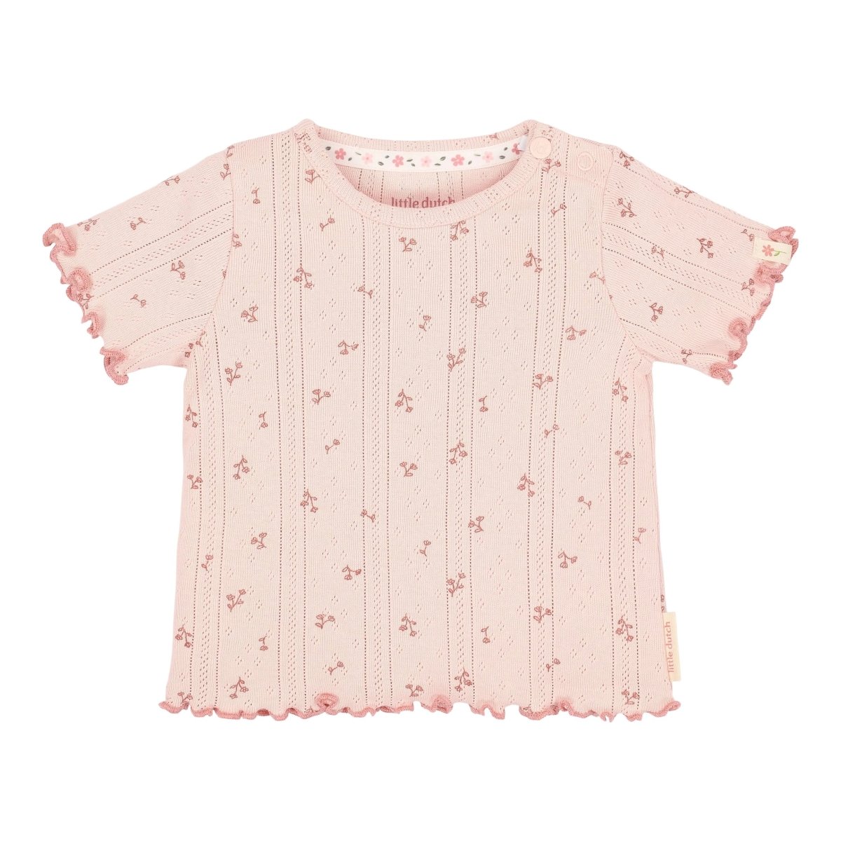 Ta koszulka z krótkim rękawem z kolekcji Fairy Flowers to oda do miękkości i wyrafinowania. Subtelna tekstura pointelle i mały kwiatowy nadruk nadają koszulce romantyczny charakter, idealny na dzień odkrywania. Przewiewna bawełna organiczna jest cudownie miękka na skórze i posiada certyfikat Oeko-Tex - miły dla Twojego malucha i otaczającego nas świata.
