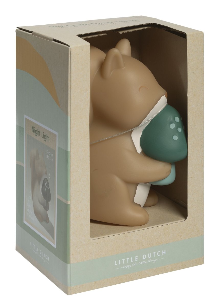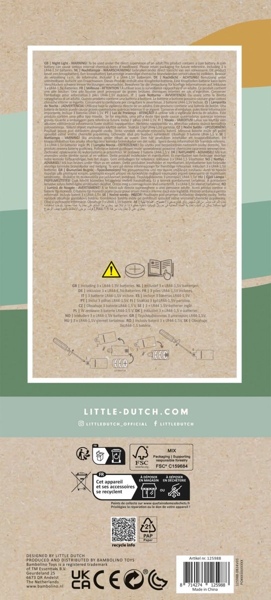 Poznaj wesołą wiewiórkę Little Dutch ! Lampka nocna roztacza delikatne światło w pokoju dziecięcym. Światło można łatwo włączyć lub wyłączyć za pomocą przełącznika na dole lampy i automatycznie wyłącza się po 12 minutach, aby oszczędzać baterie. Ta lampka nocna działa na 3 baterie guzikowe LR44 (w zestawie).