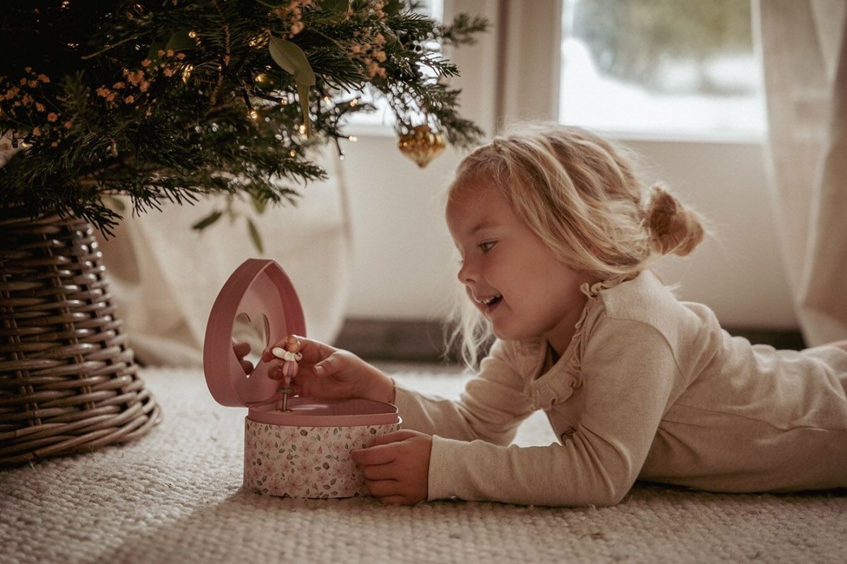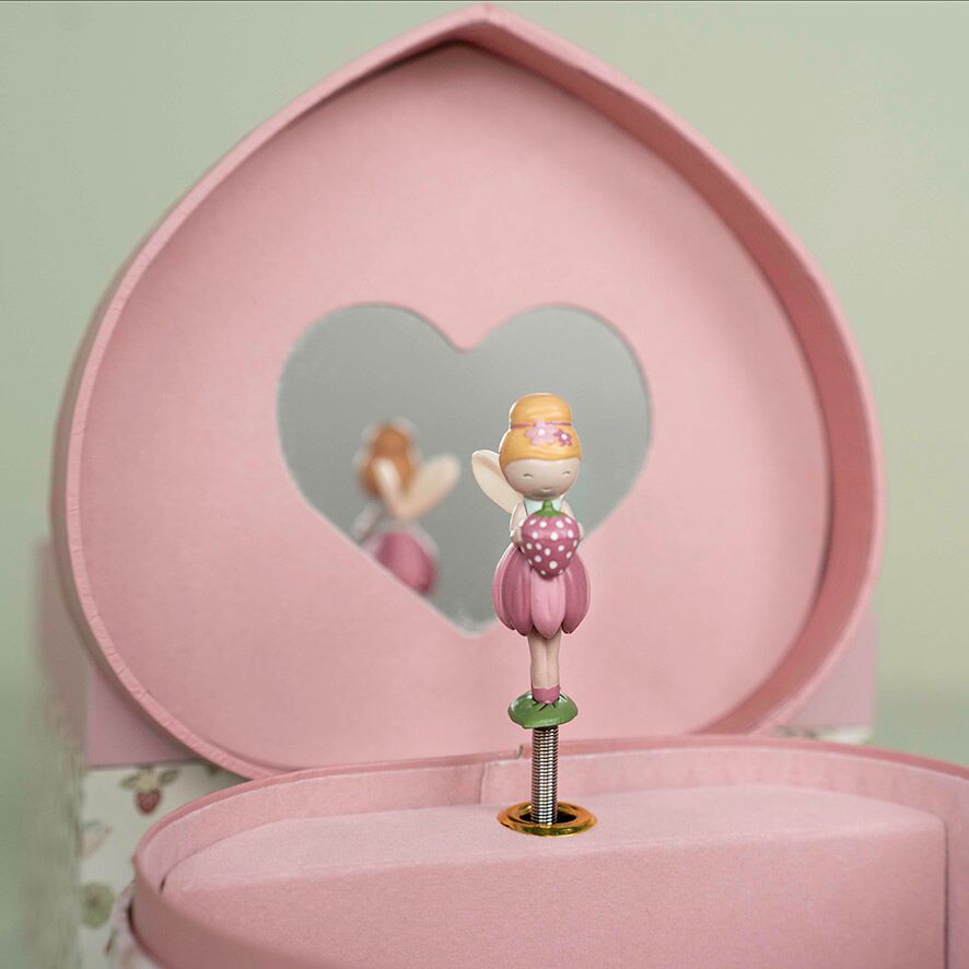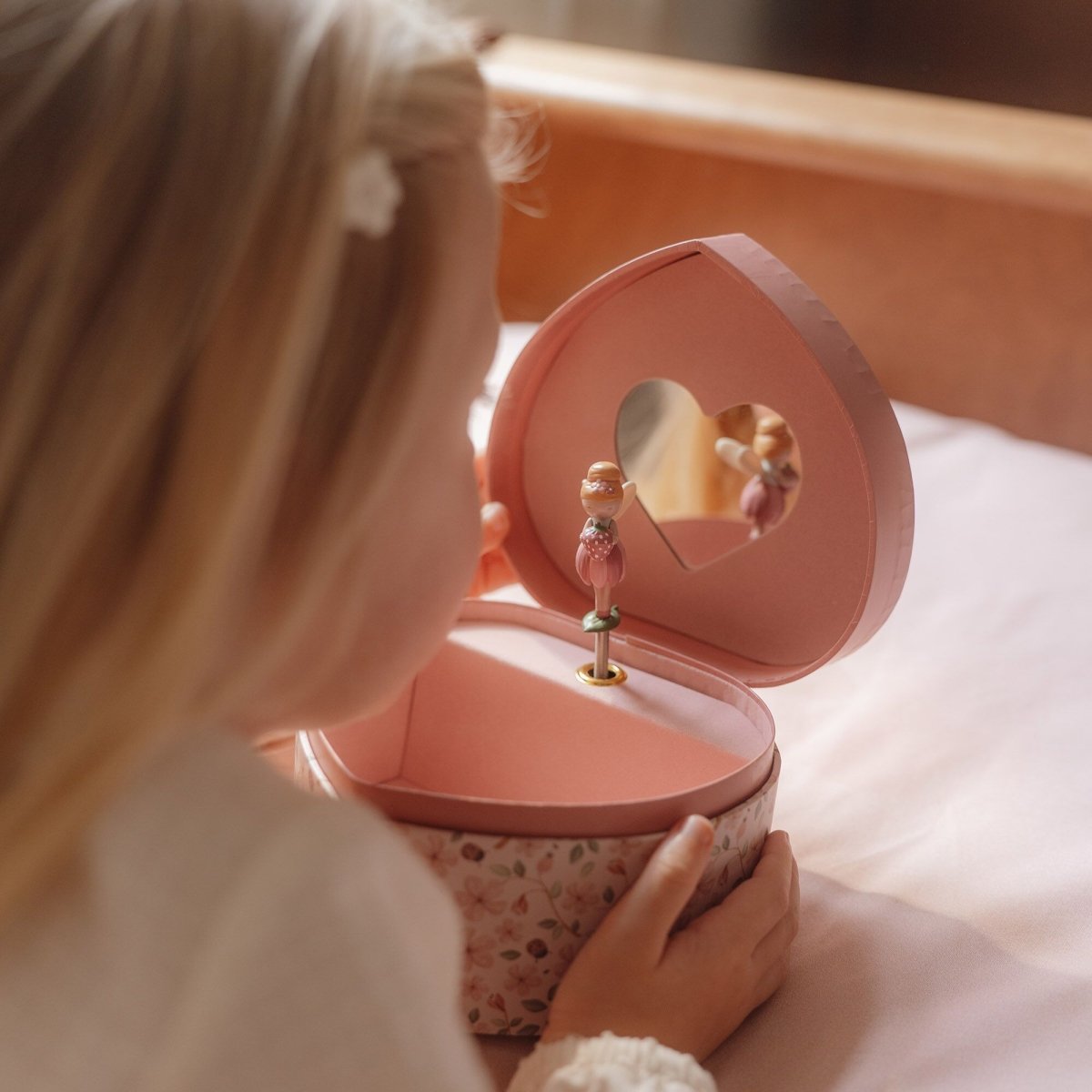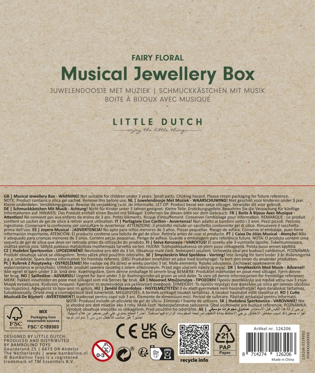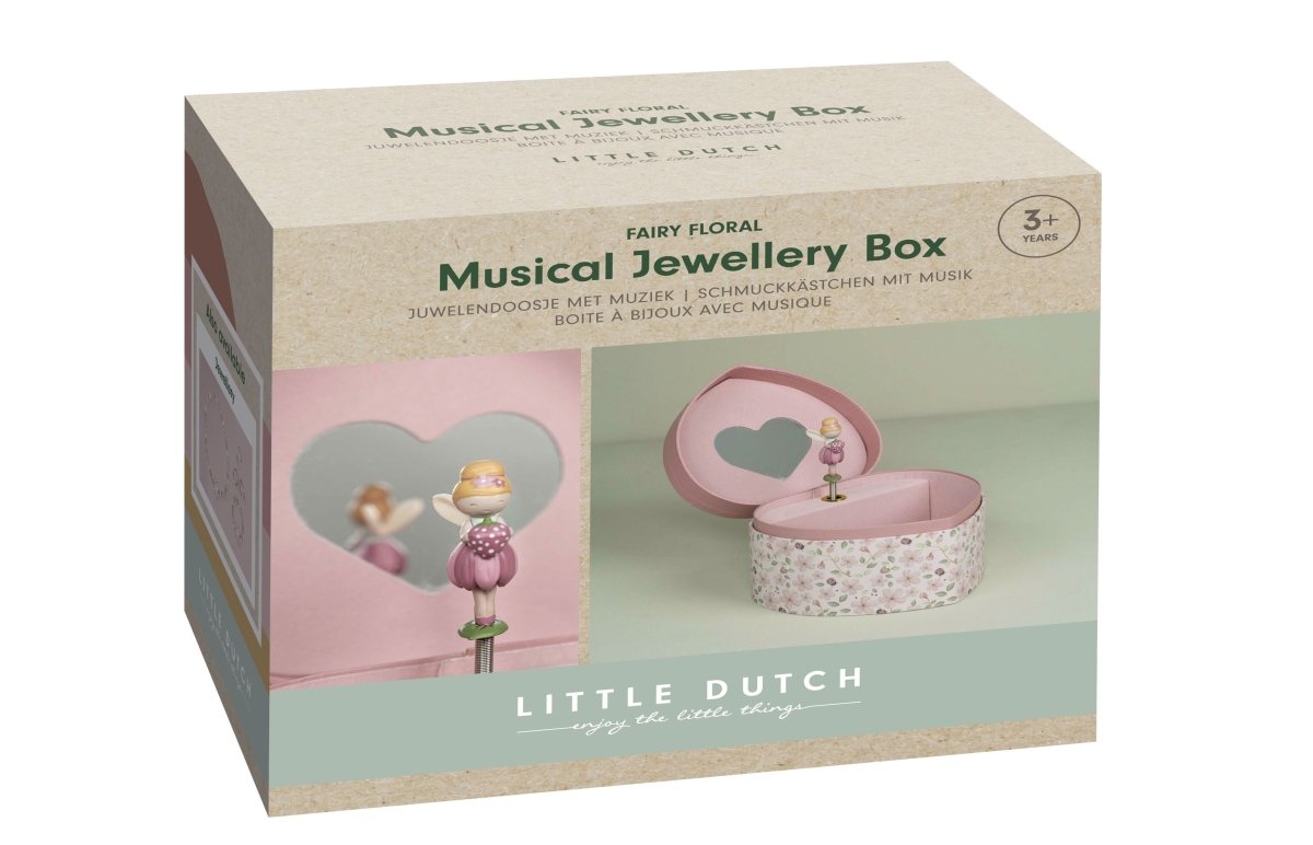 Wejdź do świata czarów z Little Dutch szkatułką na biżuterię z muzyką. To kolorowe pudełko oferuje wystarczająco dużo miejsca na najpiękniejszą biżuterię i skarby. Po otwarciu pudełka gra muzyka, a wróżka tańczy przed lustrem. Działa bez baterii, mechanizm muzyczny jest włączany za pomocą klucza z tyłu pudełka. Cenny przedmiot do pielęgnowania, stymulujący i inspirujący zmysły Twojego malucha.