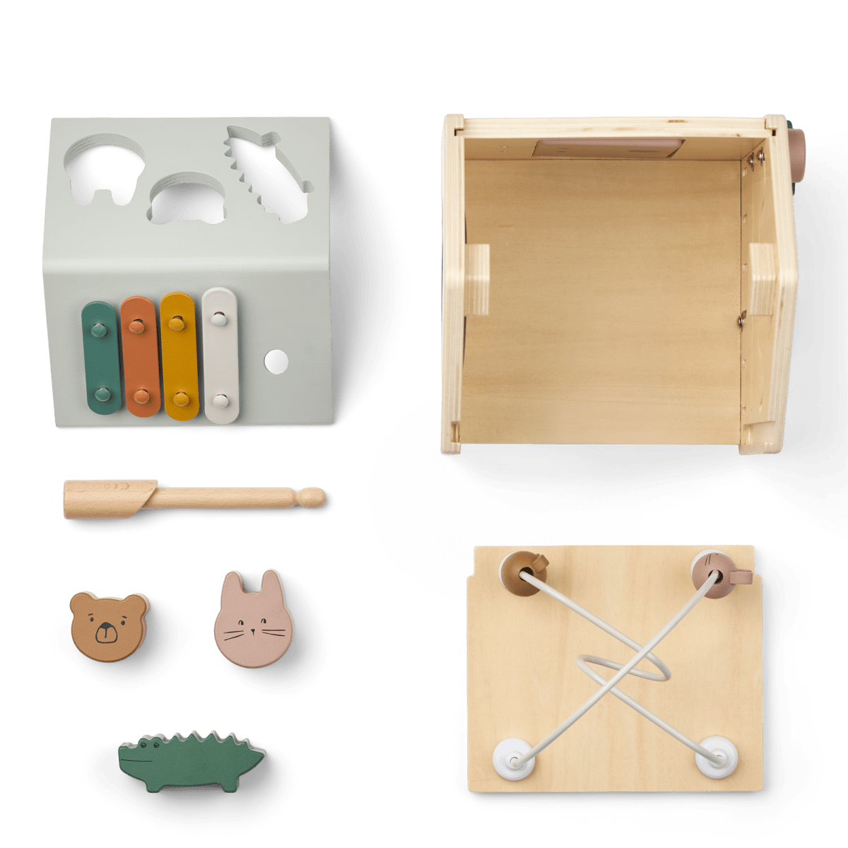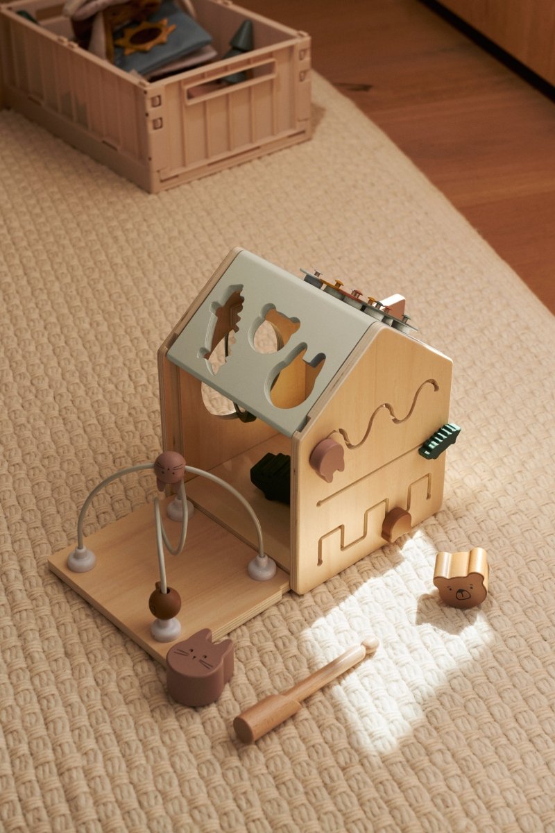 Wszechstronny i zachęcający design: Kostka aktywności w kształcie uroczego domku, pełna funkcji edukacyjnych.