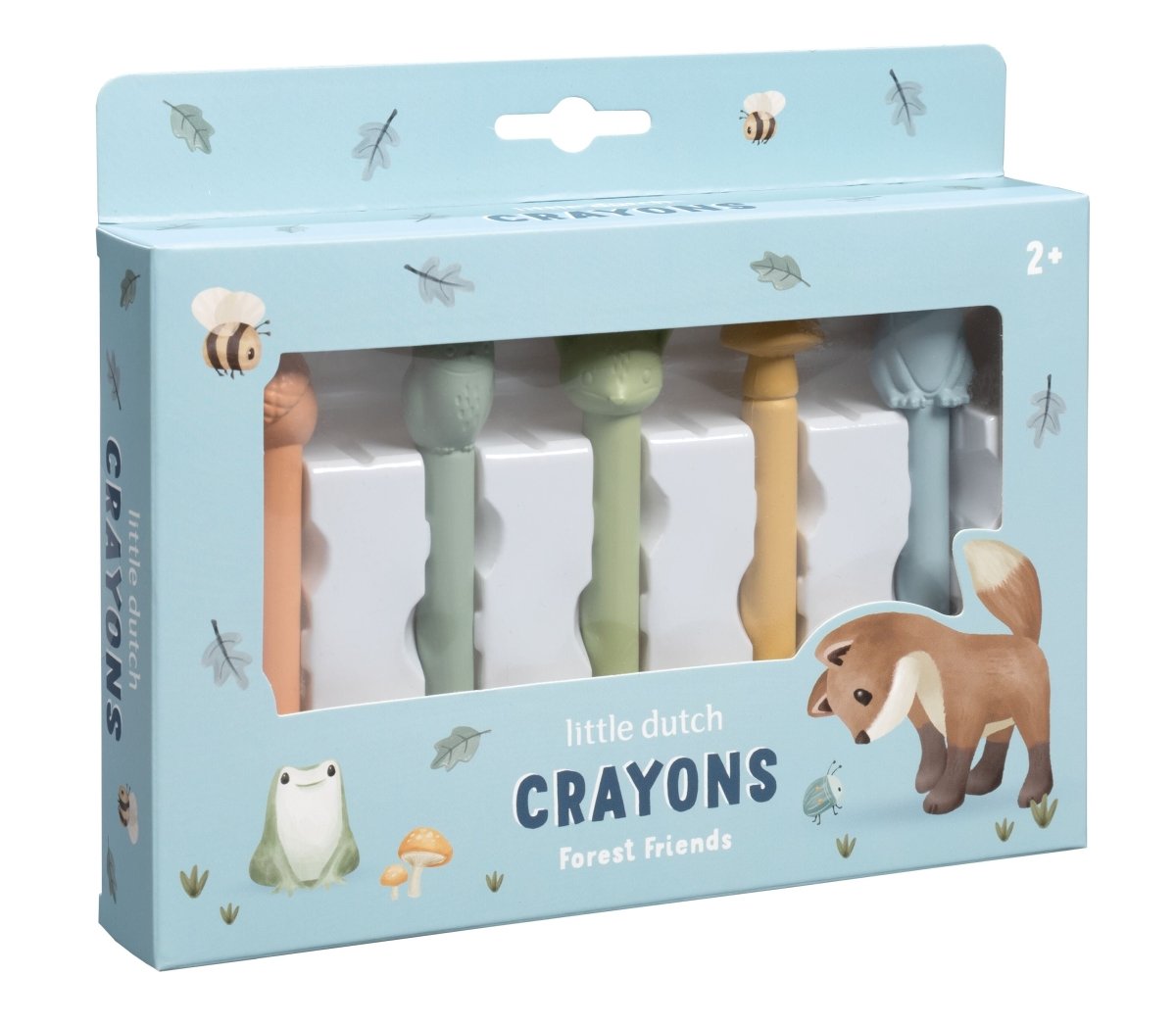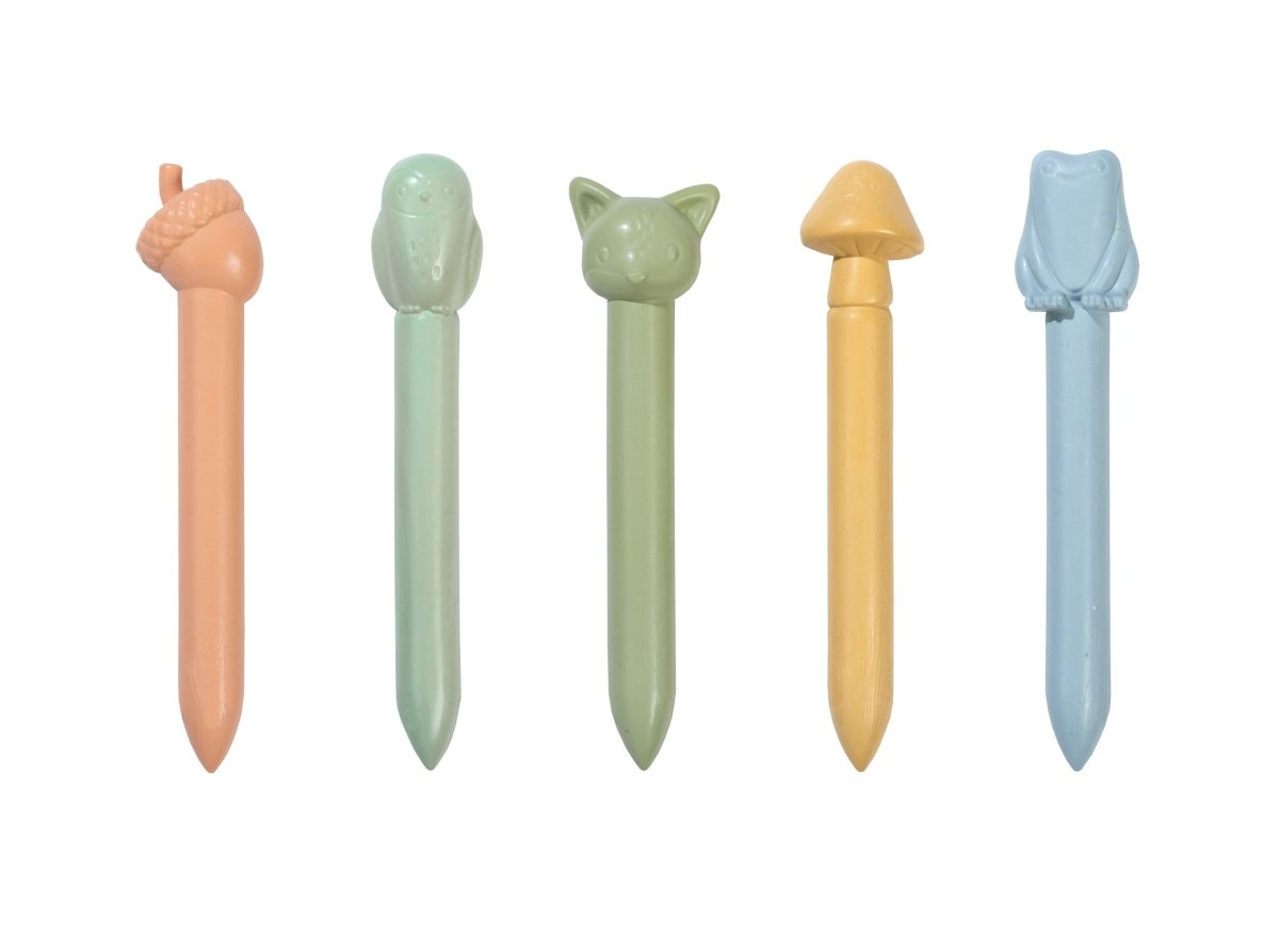 Gotowy na kreatywną leśną przygodę? Użyj kredek woskowych Forest Friends, aby narysować na papierze najpiękniejsze leśne historie! Zestaw zawiera 5 wytrzymałych kredek woskowych w naturalnych kolorach, każda z zabawną nakładką w kształcie sowy, lisa, żołędzia, grzyba lub żaby. Idealne do rysowania, a także do zabawy z wyobraźnią. Dzięki solidnemu formatowi są łatwe do trzymania przez małe rączki dzieci. Nie musisz mocno naciskać, aby uzyskać najpiękniejsze kolory na papierze. Odpowiednie dla dzieci w wieku od 2 lat.