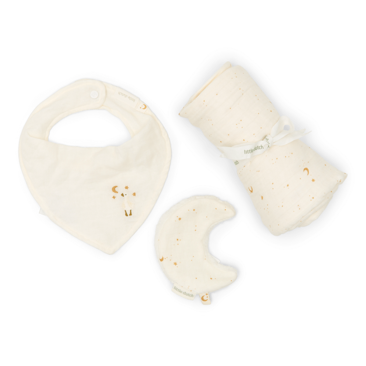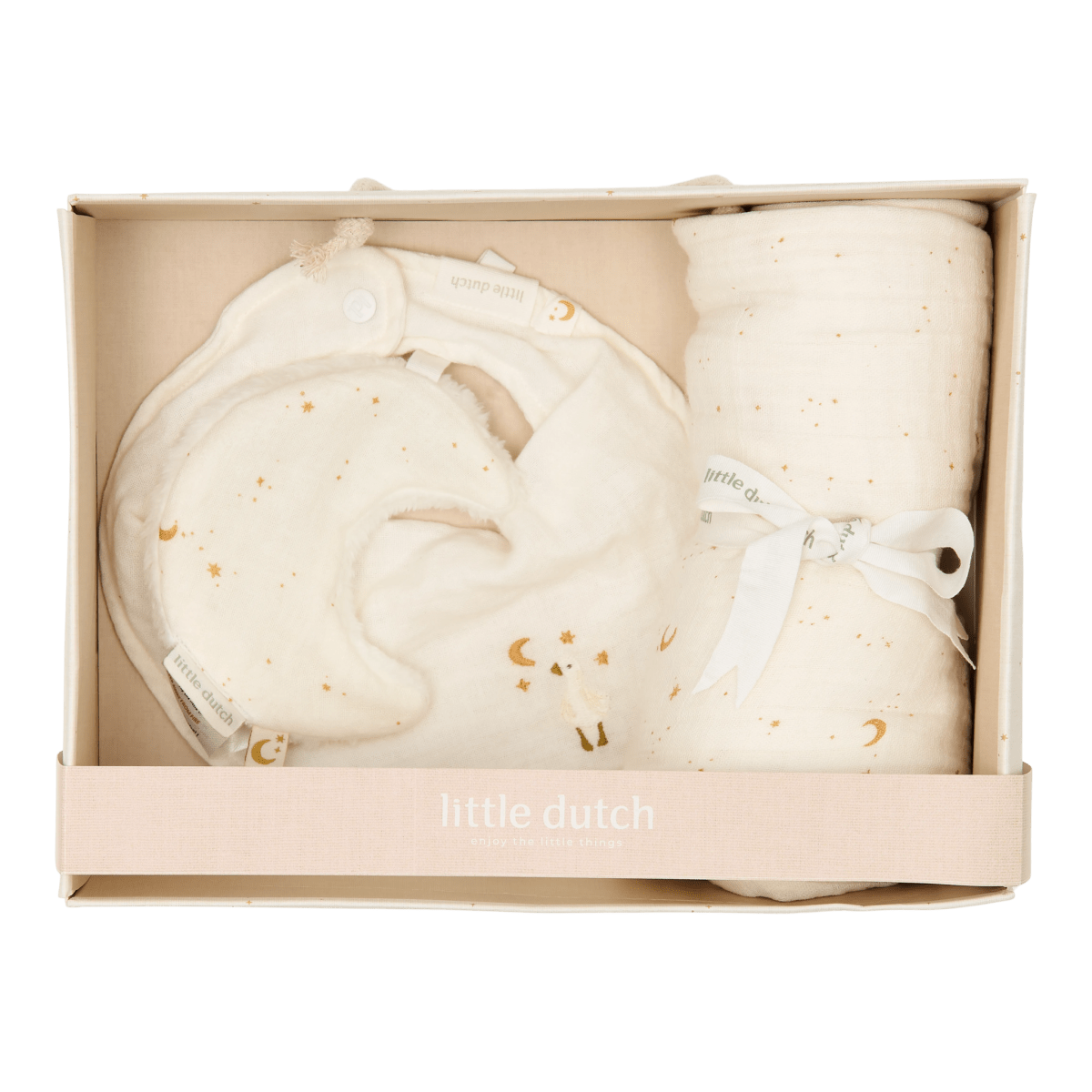 Podaruj idealny prezent dzięki temu luksusowemu pudełku upominkowemu! Zestaw zawiera 3 niezbędne elementy: hydrofilową ściereczkę i chusteczkę do nosa z uroczym nadrukiem Moon & Stars oraz bandanę w spokojnym kolorze Soft White z uroczym haftem. Wykonane z muślinu, wstępnie wyprane i pomarszczone, chusteczki i bandana są cudownie miękkie i super chłonne. Pasujące pudełko jest nie tylko idealne na prezent, ale także idealne do przechowywania wspomnień o Twoim maluchu (ponieważ wszyscy wiemy, że te pierwsze kapcie muszą być gdzieś przechowywane).