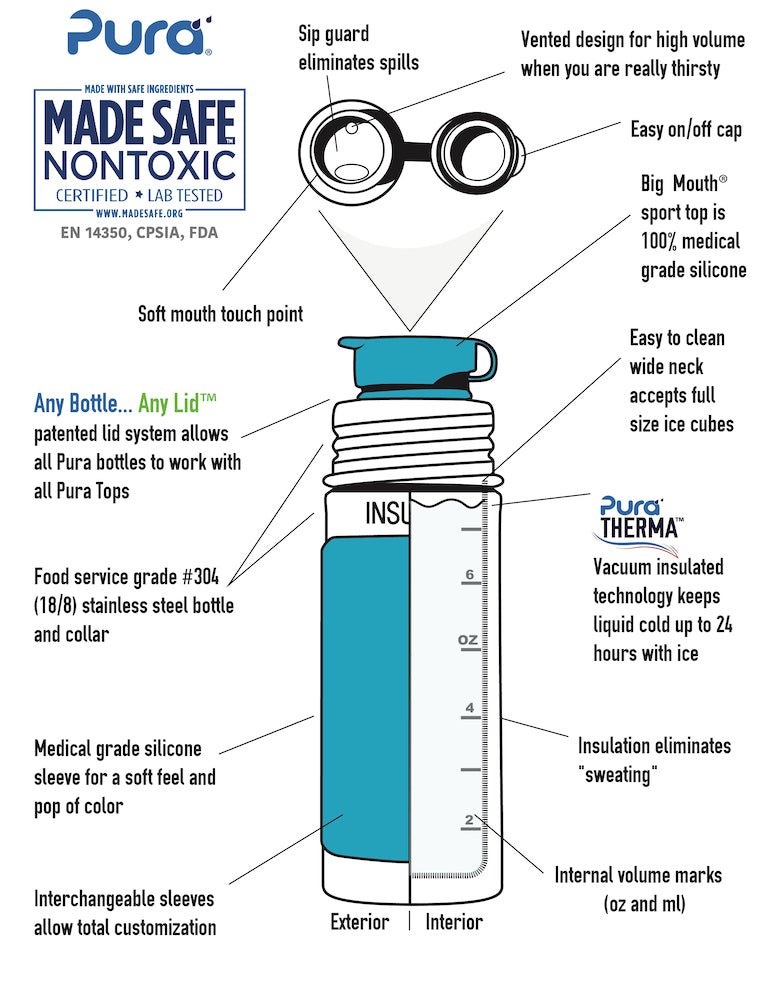 Termos ze stali nierdzewnej Pura jest jedyną na świecie butelką z wylewką w 100% wolną od plastiku i posiada certyfikat MadeSafe®. Wykonana z wysokiej jakości stali nierdzewnej i silikonu medycznego, jest wolna od BPA, BPS, PVC, ftalanów i ołowiu. Ta wielokrotnie nagradzana butelka jest zatem całkowicie bezpieczna dla Ciebie, Twojej rodziny i środowiska