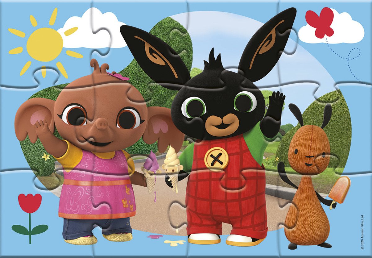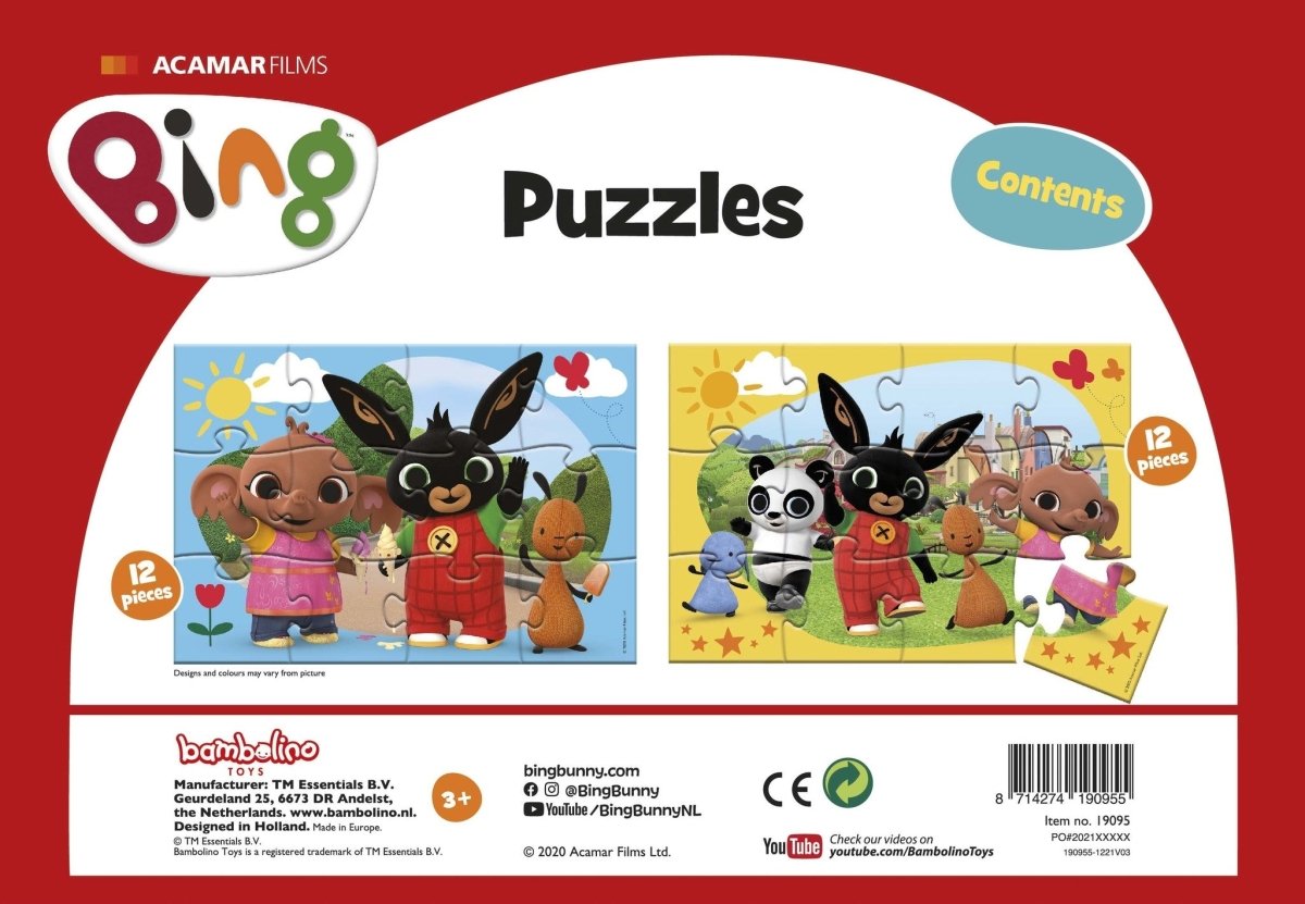 Zestaw składa się z 2 układanek po 12 elementów każda z kolorowym obrazkiem Binga i jego wesołych przyjaciół Suli, Pandy i przytulanki Flor. Układanie puzzli jest jedną z pierwszych czynności, które dziecko wykorzystuje do trenowania umiejętności motorycznych i odkrywania nowych.