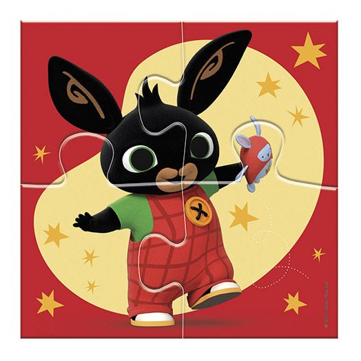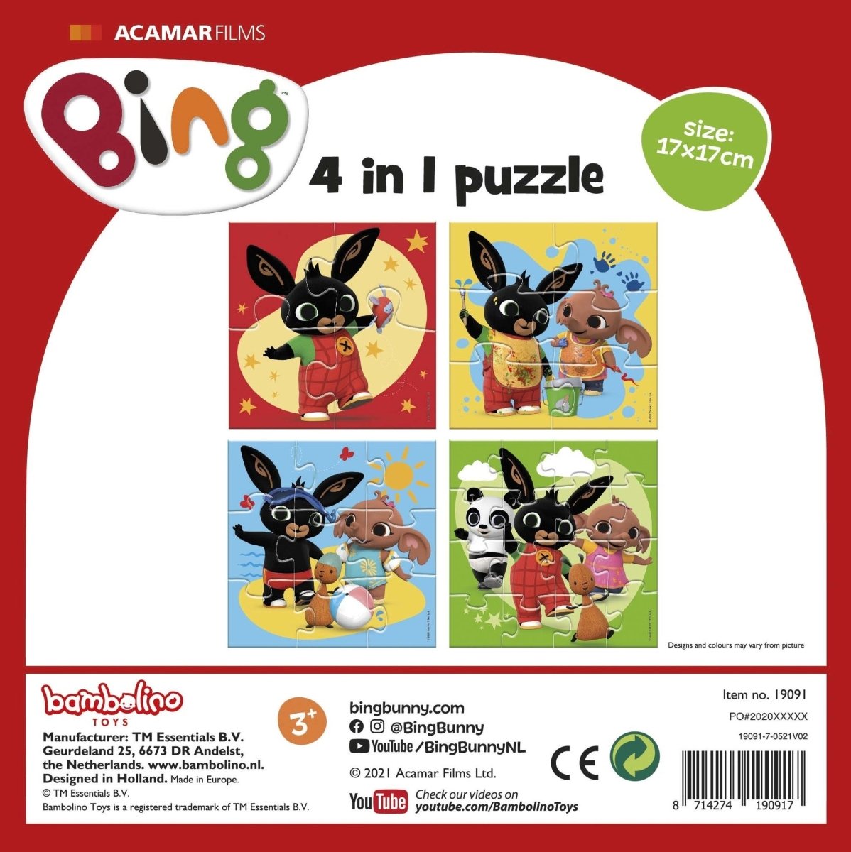 Zestaw składa się z 4 puzzli, z których każdy zawiera kolorowy obrazek przedstawiający Binga, samego lub razem z jednym z jego licznych, wesołych przyjaciół: Sulą, Pandą i przytulanką Flor. Układanie puzzli to jedna z pierwszych czynności, które dziecko wykorzystuje do ćwiczenia umiejętności motorycznych. Najmłodsi puzzlomaniacy zaczynają od 4-elementowej układanki, a ci, którzy są gotowi na kolejne wyzwanie, mogą ukończyć 6-, 9- lub 16-elementową układankę.