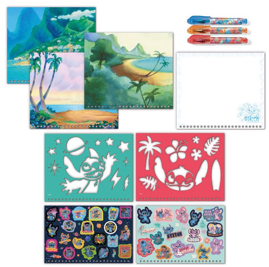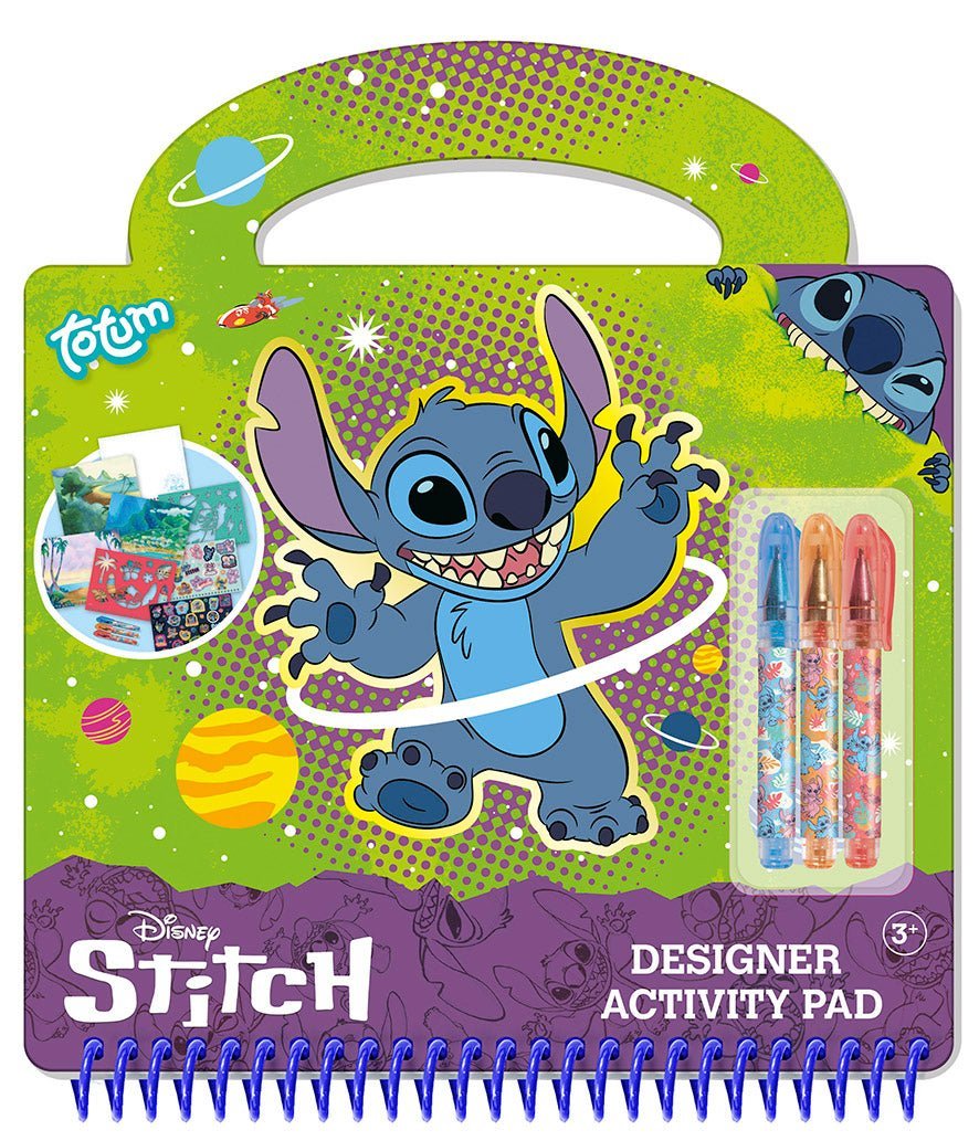 Dzięki tej zabawnej, zamykanej książeczce z ćwiczeniami, 20 arkuszom wstępnie zadrukowanego papieru, szablonom i naklejkom, tłom do zabawy i 3 długopisom żelowym możesz stworzyć najpiękniejsze projekty Disney Stitch. Kompletna książka z motywem popularnego bohatera Disneya Sticha i jego przyjaciela Anioła, w tym 3 kolory brokatowych długopisów żelowych. Wyposażona w twardą okładkę, segregator i zamknięcie na rzep, jest to idealny przedmiot, który możesz zabrać ze sobą na wakacje, do restauracji lub w odwiedziny. Dzięki niej nie będziesz się nudzić ani przez chwilę i będziesz ćwiczyć wszystkie swoje umiejętności rysowania i naklejania!