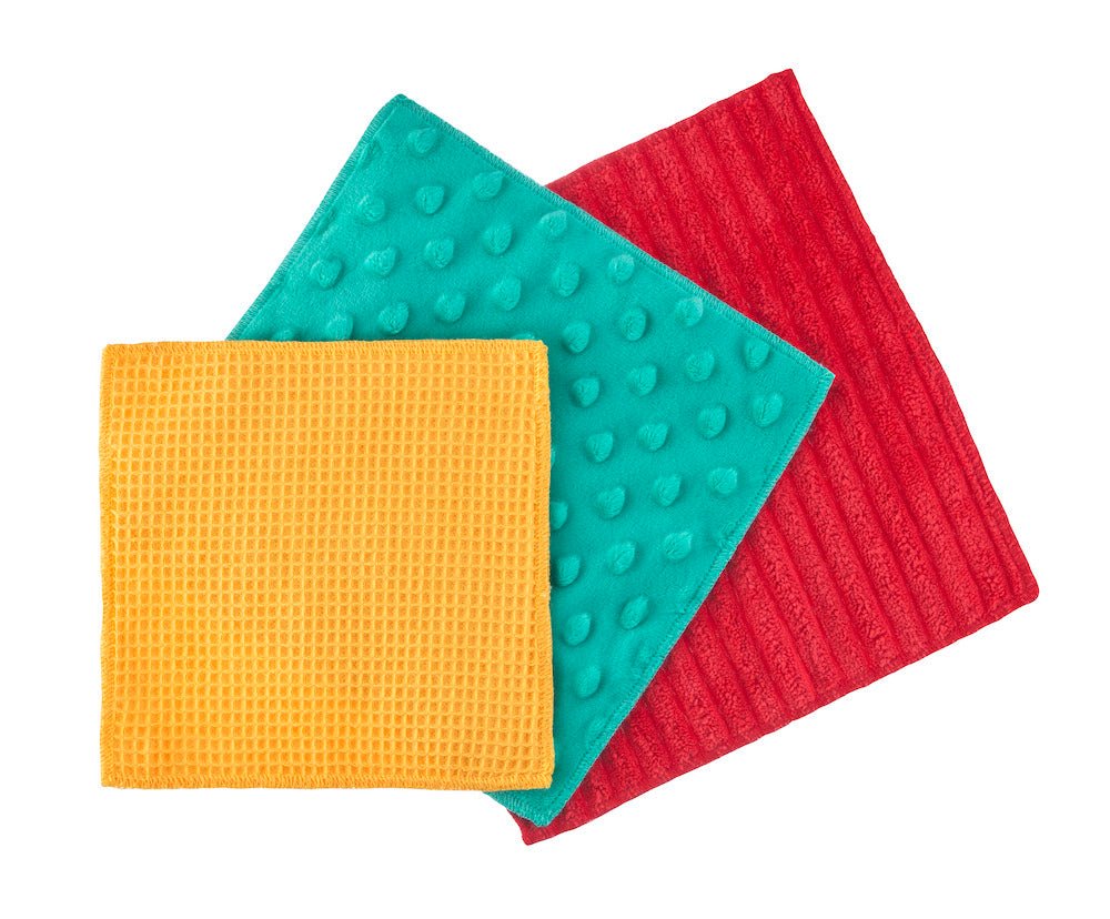 3 ściereczki, z których jedna ma marszczony papier i różne tekstury, aby rozwijać zmysł dotyku