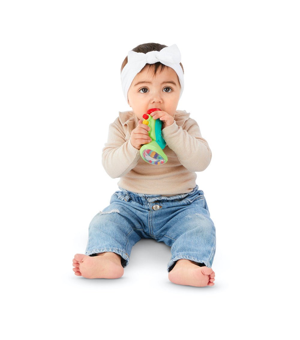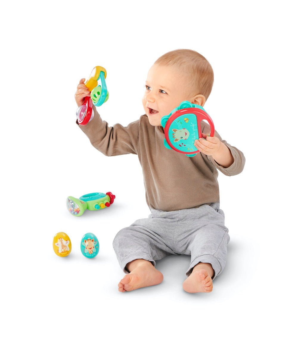 Podaruj swojemu dziecku jego pierwszy zestaw muzyczny z instrumentami idealnie dopasowanymi do małych rączek. Zestaw zawiera bębenek, dwa marakasy w kształcie jajka, trąbkę i grzechotkę w kształcie nuty. Dzięki nim możesz tworzyć muzykę na wiele sposobów.