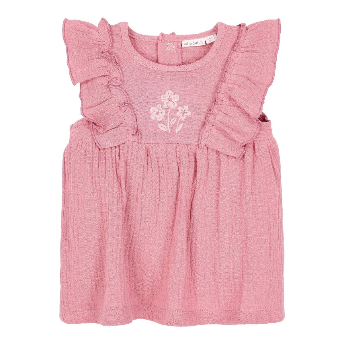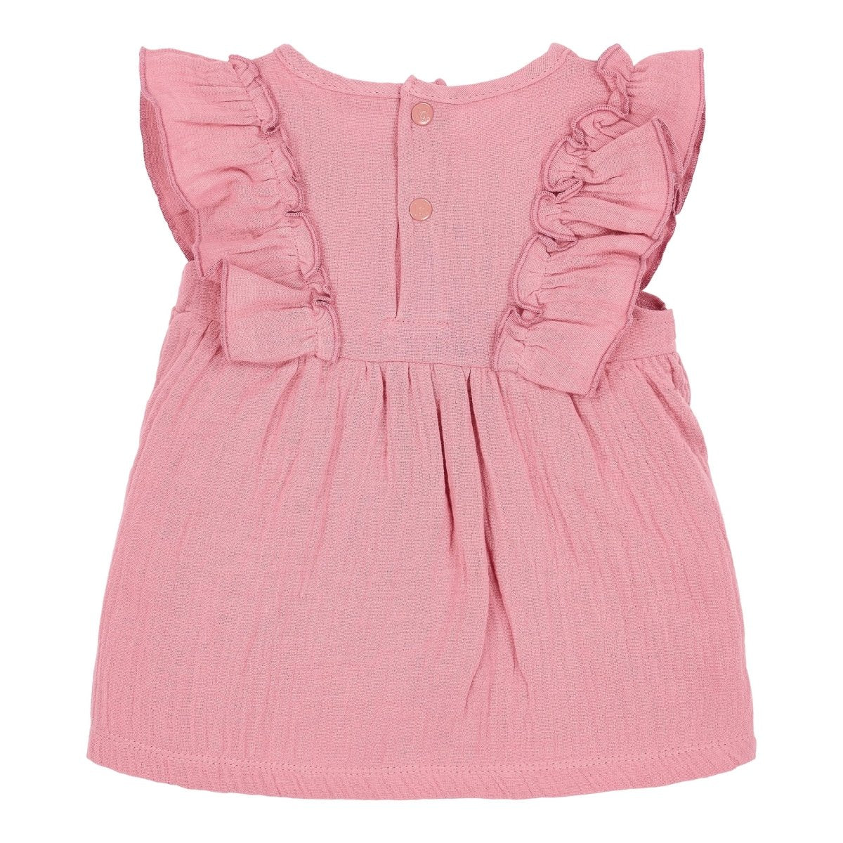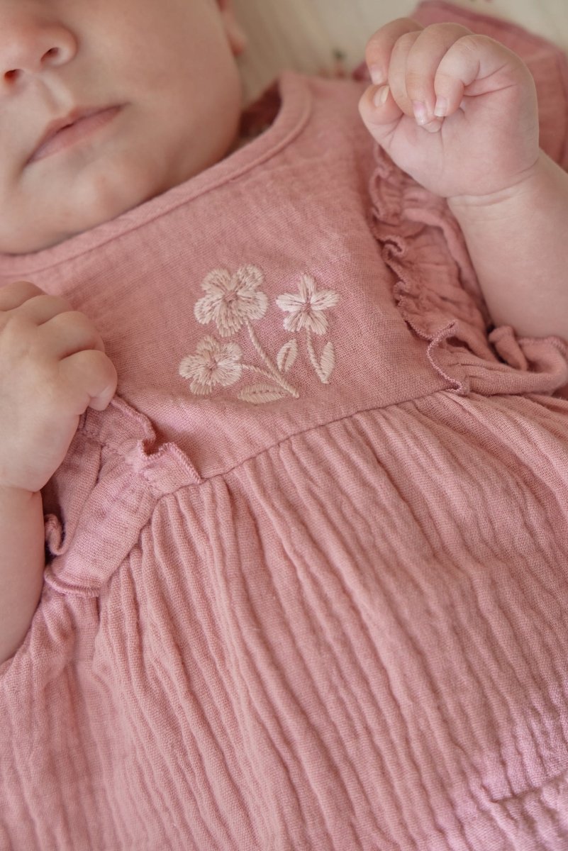 Miękka, delikatna i całkowicie letnia. Wykonana z przewiewnego muślinu sukienka Pink Blush tańczy z każdym krokiem. Falbany wzdłuż ramion dodają jej figlarnego charakteru, a haftowany kwiatowy wzór na piersi stanowi słodki i wyrafinowany akcent. Do sukienki dołączone są pasujące figi z elastycznym paskiem i uroczą kokardką - wygodne, a jednocześnie stylowe, dokładnie to, czego potrzebuje Twoje maleństwo.