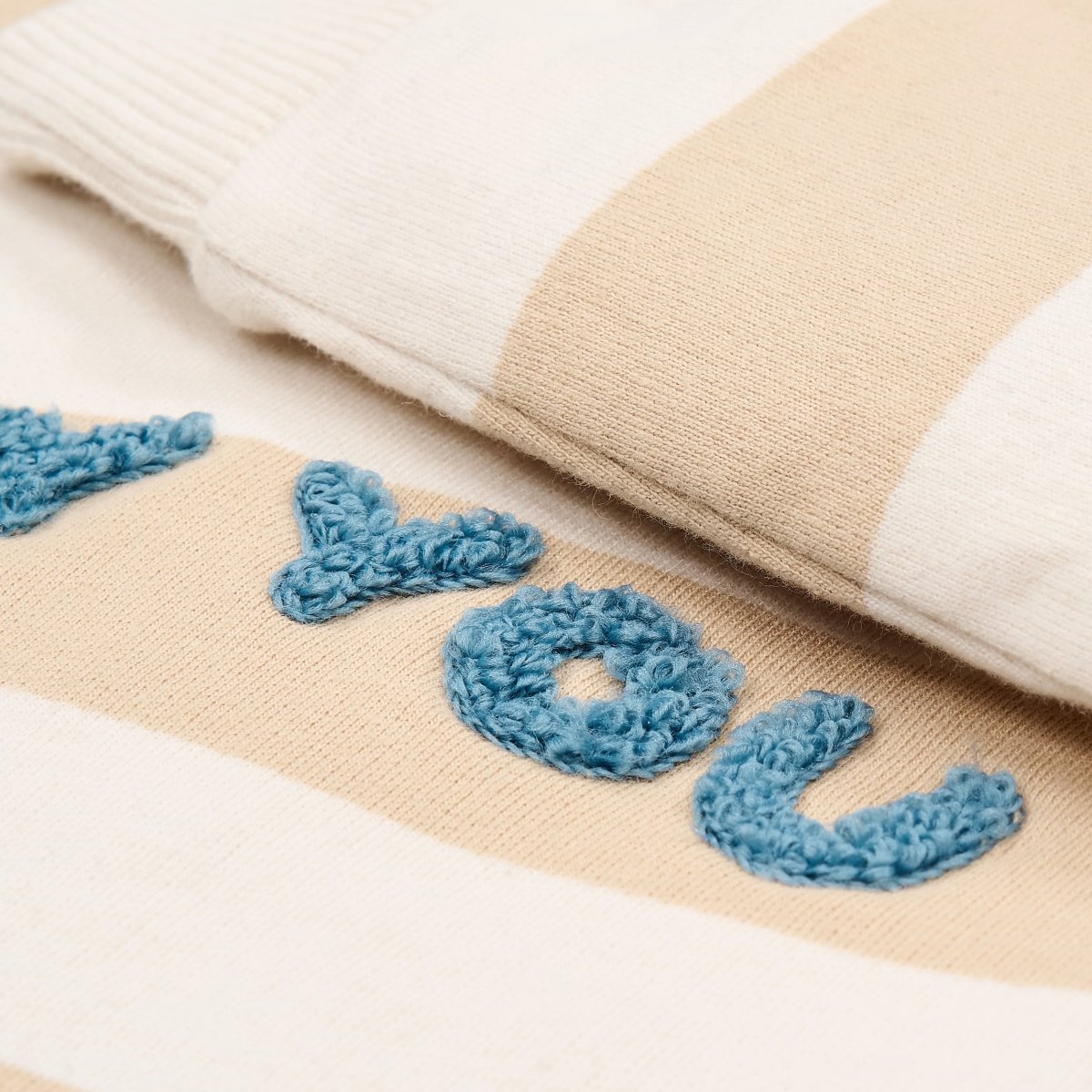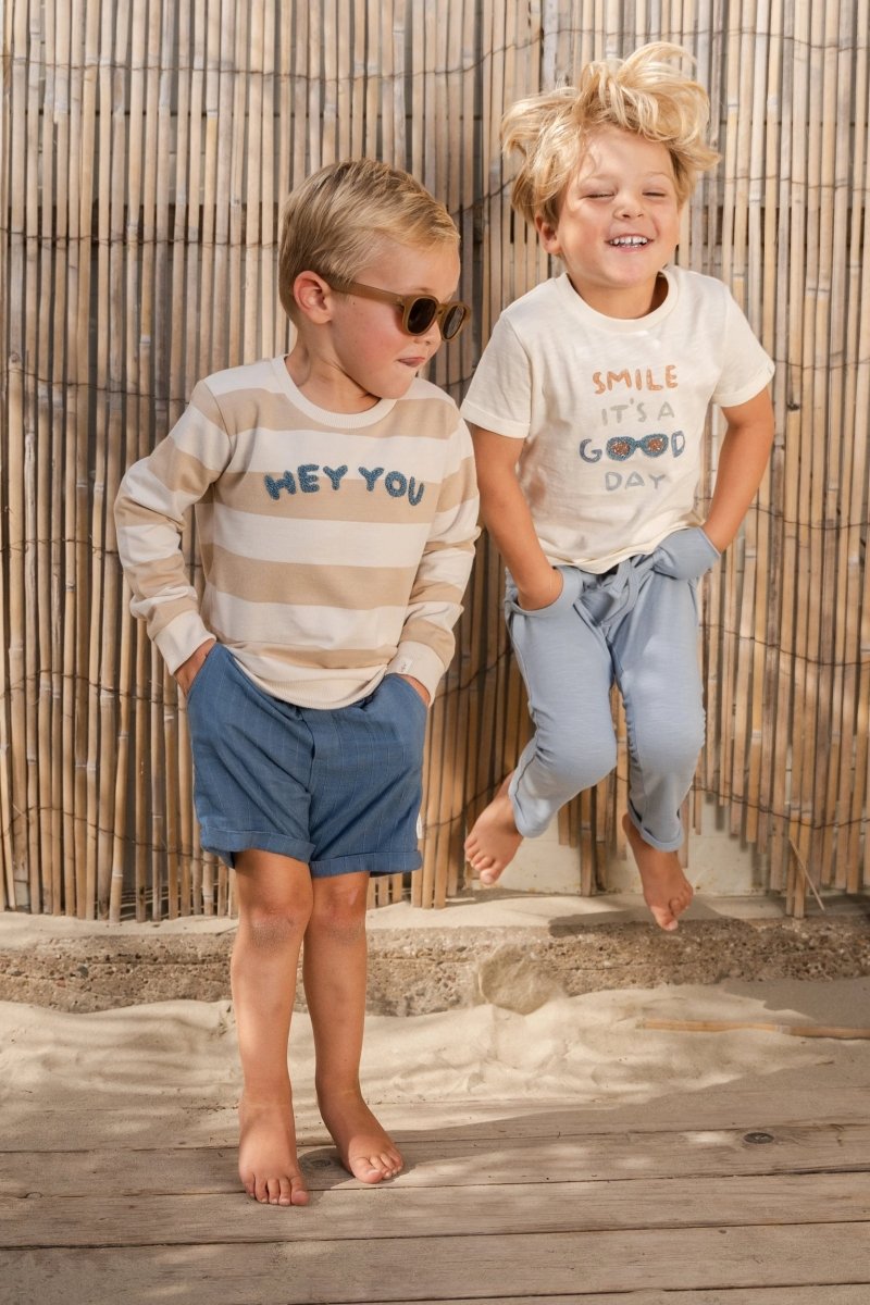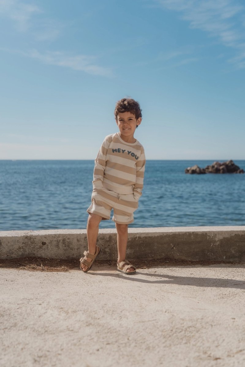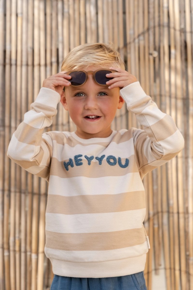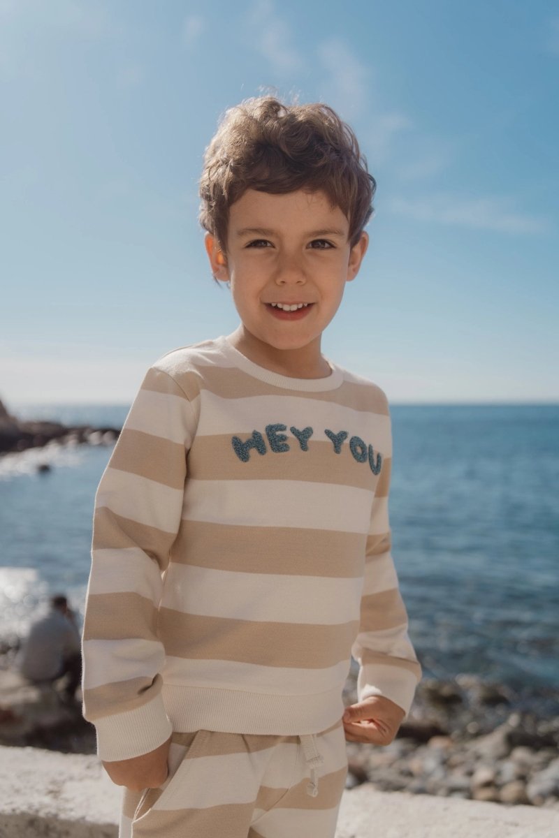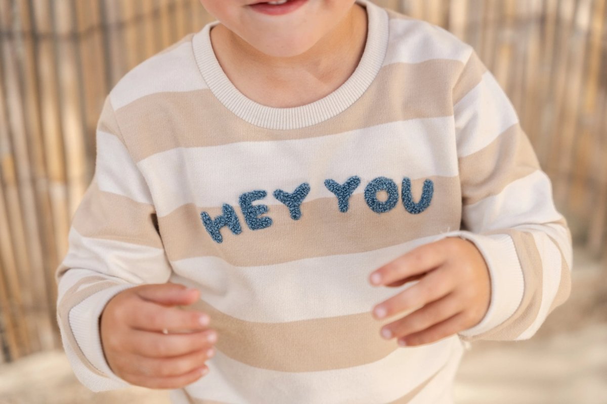 Miękki, chłodny i zawsze gotowy do przytulania: ten sweter w kolorze biszkoptowym z szerokimi paskami jest idealny na chłodne dni. Jakość lekkiego potu jest cudownie miękka i zapewnia Twojemu maluchowi komfortowe ciepło. Wyhaftowane litery na piersi Hey Youto wesoły akcent na każdy dzień. Kontrastowe mankiety dodają zabawnego akcentu. Wykonany w 100% z bawełny organicznej z certyfikatem Oeko-Tex, sweterek jest miękki dla skóry i idealny do ruchu i zabawy.