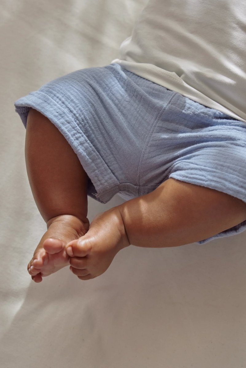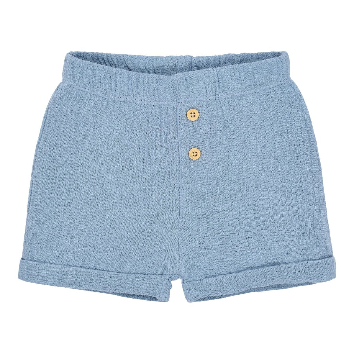 Lekkie i przewiewne, gotowe na lato. Te szorty w kolorze Stone Blue są wykonane z miękkiego muślinu, który świetnie się nosi w ciepłe dni. Elastyczny pas z guzikami o wyglądzie drewna nadaje szortom naturalny, letni wygląd. Podwijane nogawki zapewniają zabawne i stylowe wykończenie.