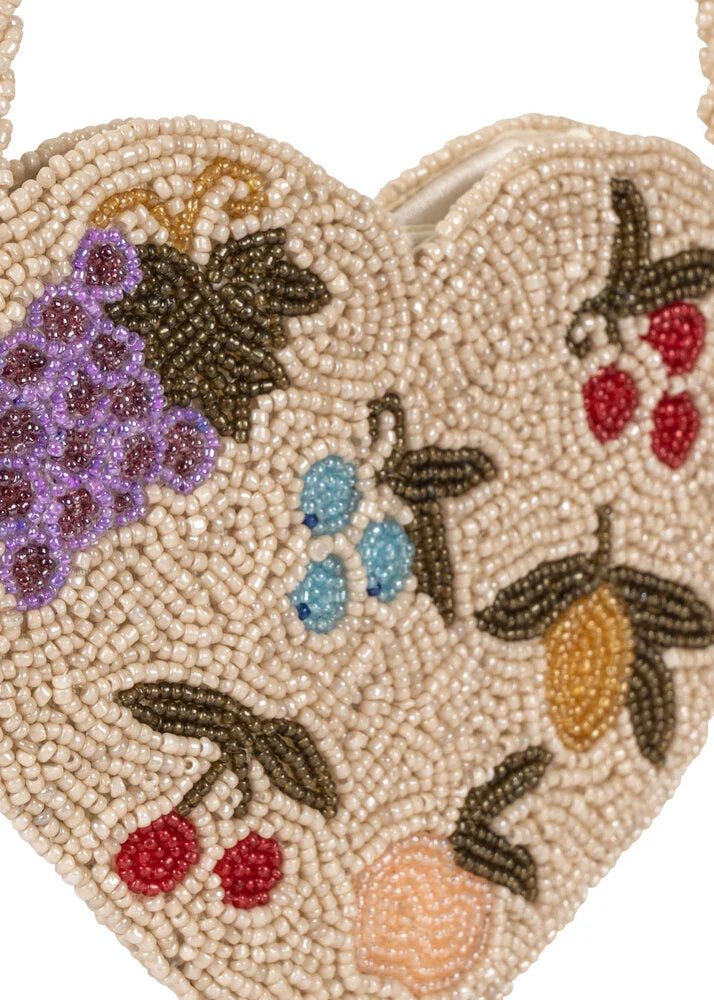 Urocza torebka na ramię w kształcie serca ozdobiona ręcznie nakładanymi koralikami. Każda torba jest wyjątkowa dzięki ręcznie wykonanemu charakterowi. Idealna do odgrywania ról lub jako dodatek do lalek.