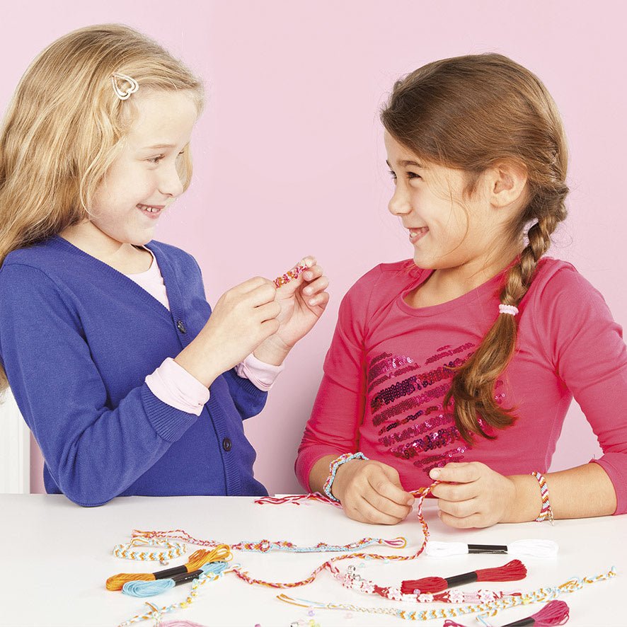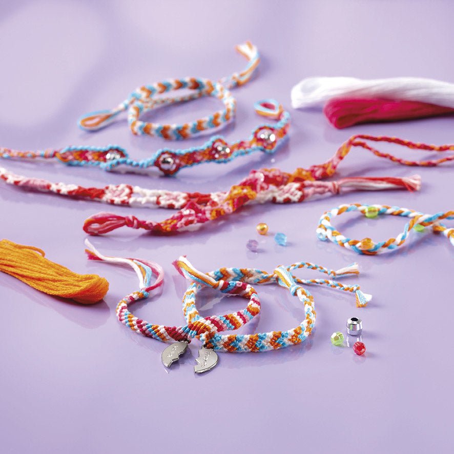 Stwórz bransoletki przyjaźni w różnych kolorach z dodatkowymi koralikami i zawieszkami. Zawartość: druciki w różnych kolorach, zawieszki Best Friends, koraliki i instrukcje.