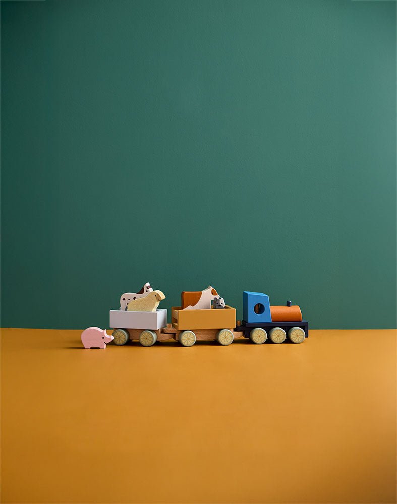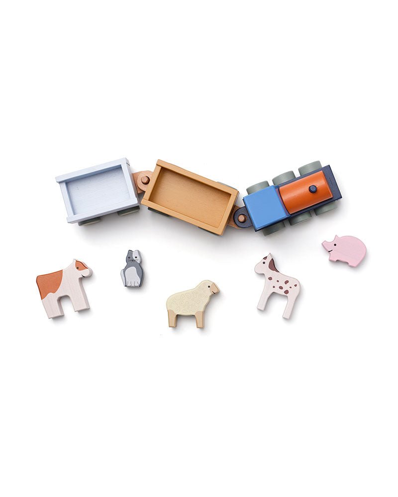 Wsiądź do pociągu! Ten uroczy drewniany pociąg jest wyposażony w dwa wagony i pięć sympatycznych zwierząt gospodarskich: krowę Mirę, konia Maxa, świnkę Poppy, owcę Bellę i kota Sture'a . Dzieci mogą załadować zwierzęta do wagonów i wymyślać własne historie podczas pchania pociągu
